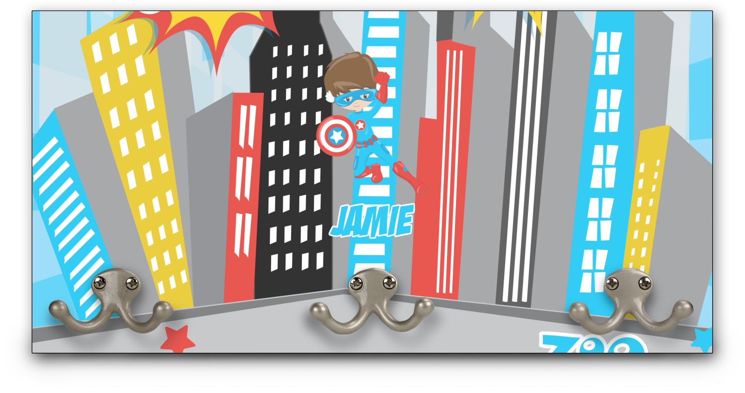 This coat rack is the perfect way to add some personality to your wall or entryway. The board is made of a strong maple that is approximately 16" x 8". The three 2-prong hooks are a sturdy metal that have three screws attaching them to the board. Your design is printed right onto the front of the board while the back and sides are a simple black.