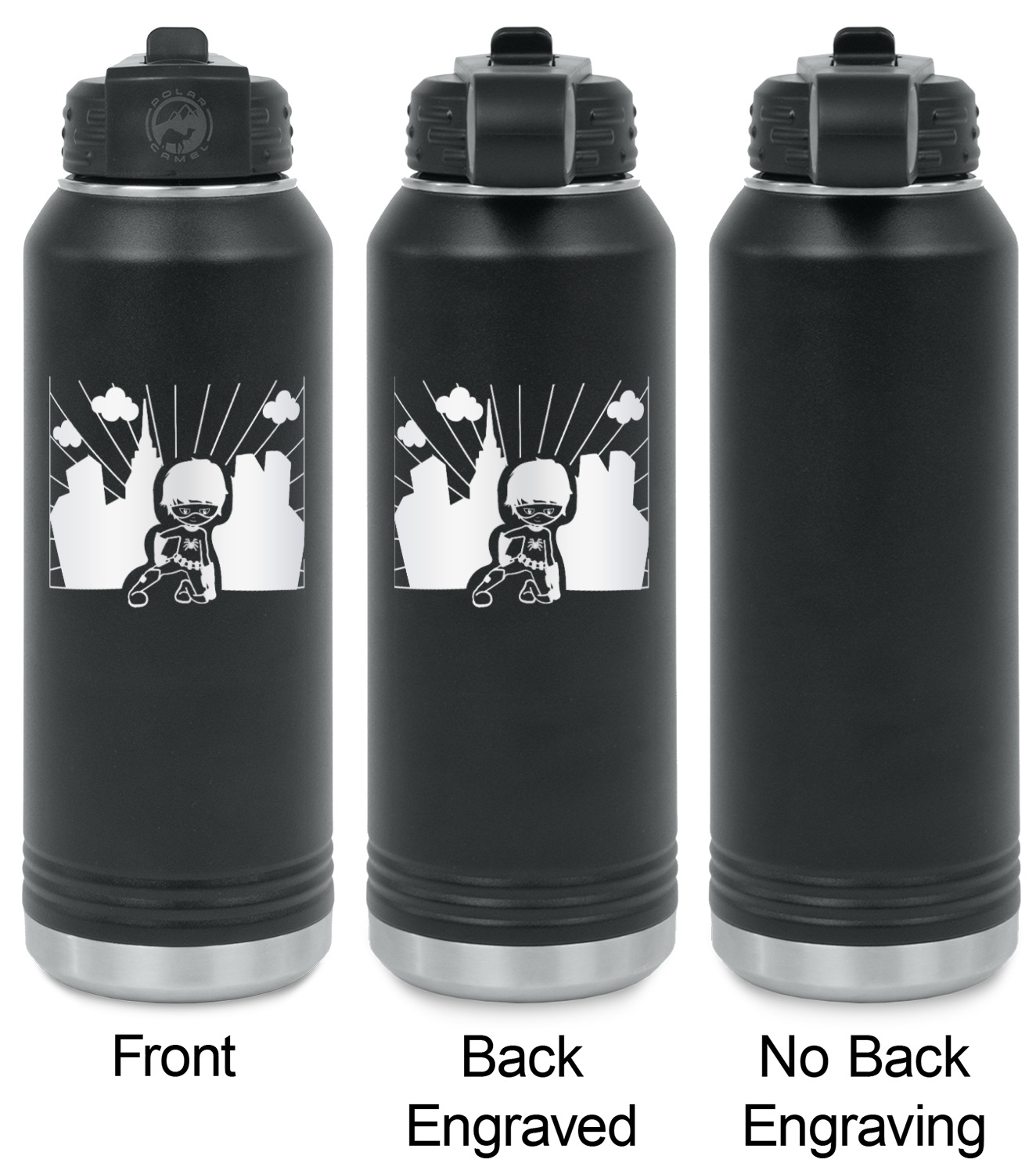 Your design is laser engraved on the water bottles. The engraving removes the black powder coating in the designed area to expose the silver stainless steel underneath.