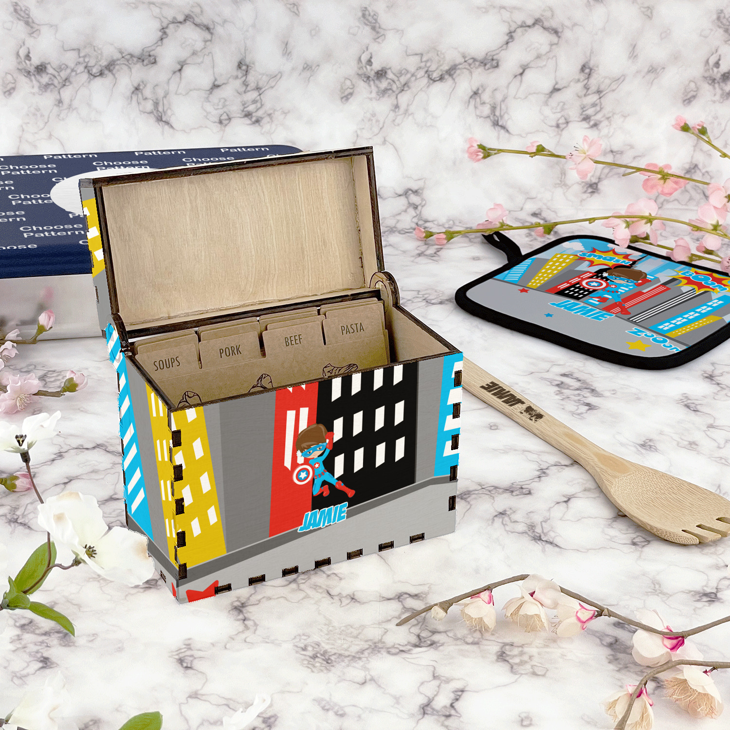 For a classic look for your kitchen counter to hold all of your family heirloom recipes look no further than this full color printed wood recipe box. These recipe boxes are sure to add a nice custom touch to your kitchen and allow you to proudly display your treasured family recipes in a beautiful custom recipe box.