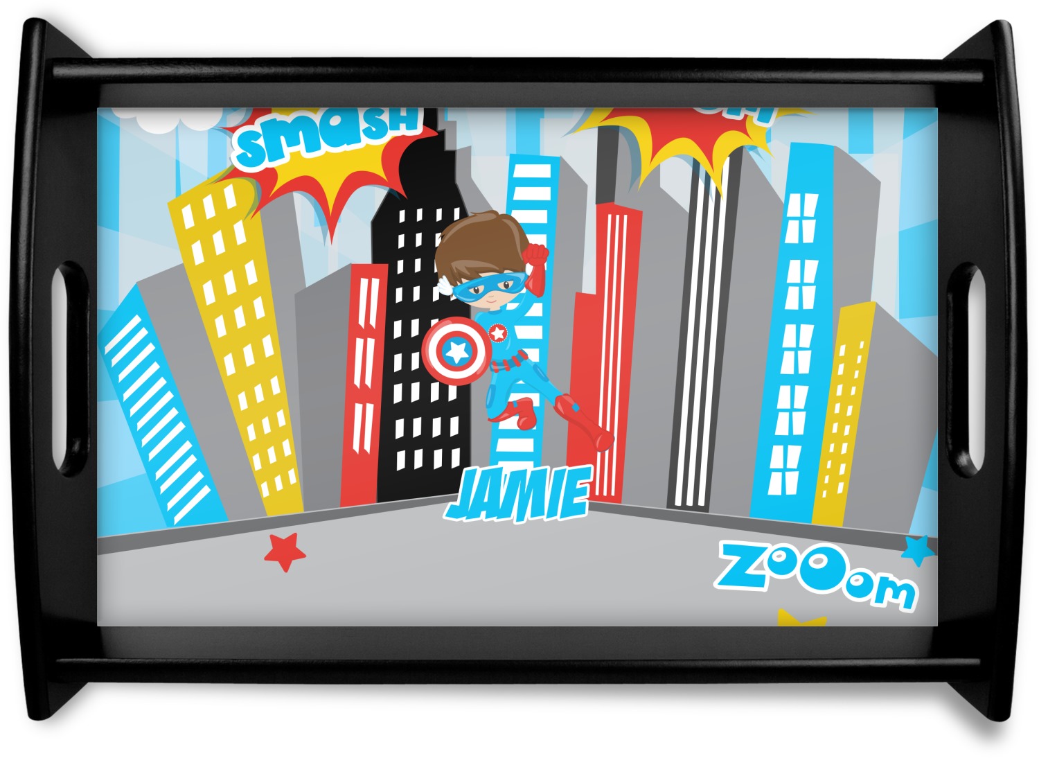 This serving tray with handles features square edges and two rounded sides, creating a very modern look. Each side is fabricated from a beautifully cut, natural wood. The bottom of the interior of the tray displays your customized design in bright, vibrant color. The tray is sold in both a black color and a natural wood look. Each variation of the wood serving tray has two sizes: Small, which is 14" x 10" x 2.25", and Large, which is 19.5" x 13.5" x 2.75".