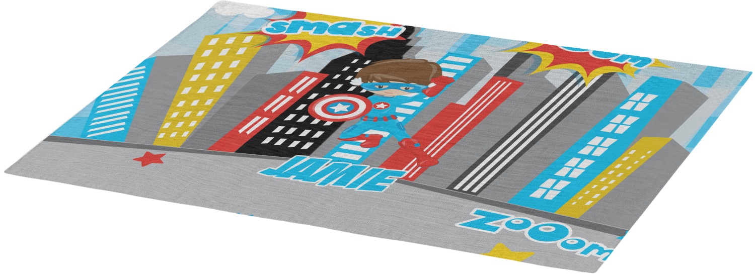 Each of our table mats are a poly twill material with woven burlap detailing. This creates a soft, quality placemat for us to fully print your personalized design across. The woven twill also adds a wrinkle-free surface to set your table! Each customizable placemat is a rectangle shape measuring at approximately 13 x 18 and printed here in the USA.