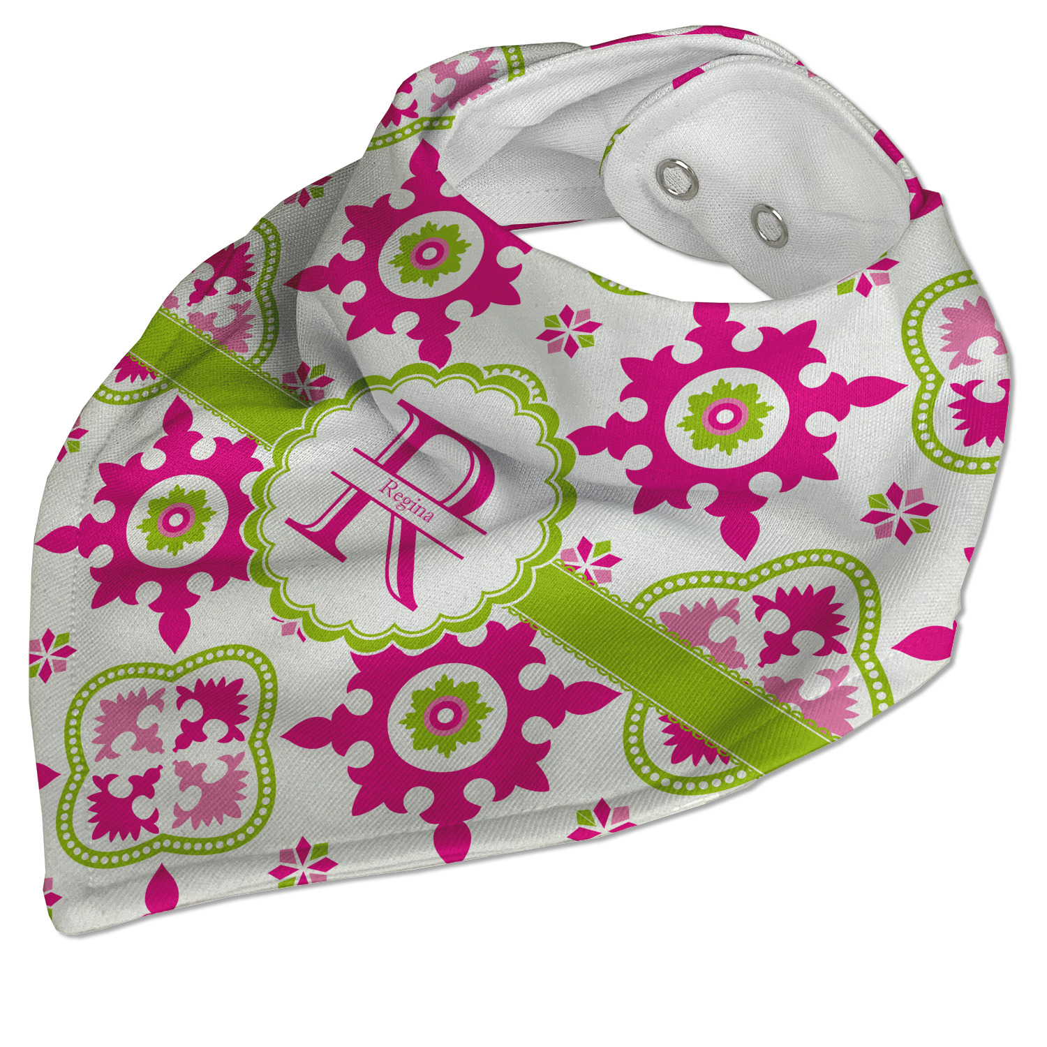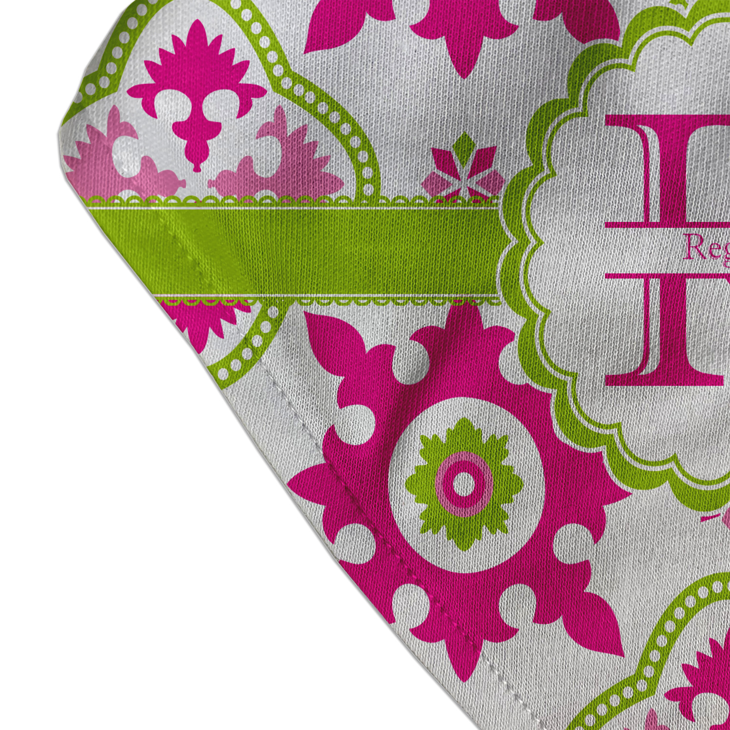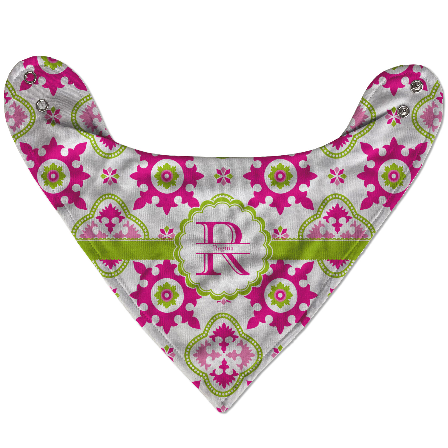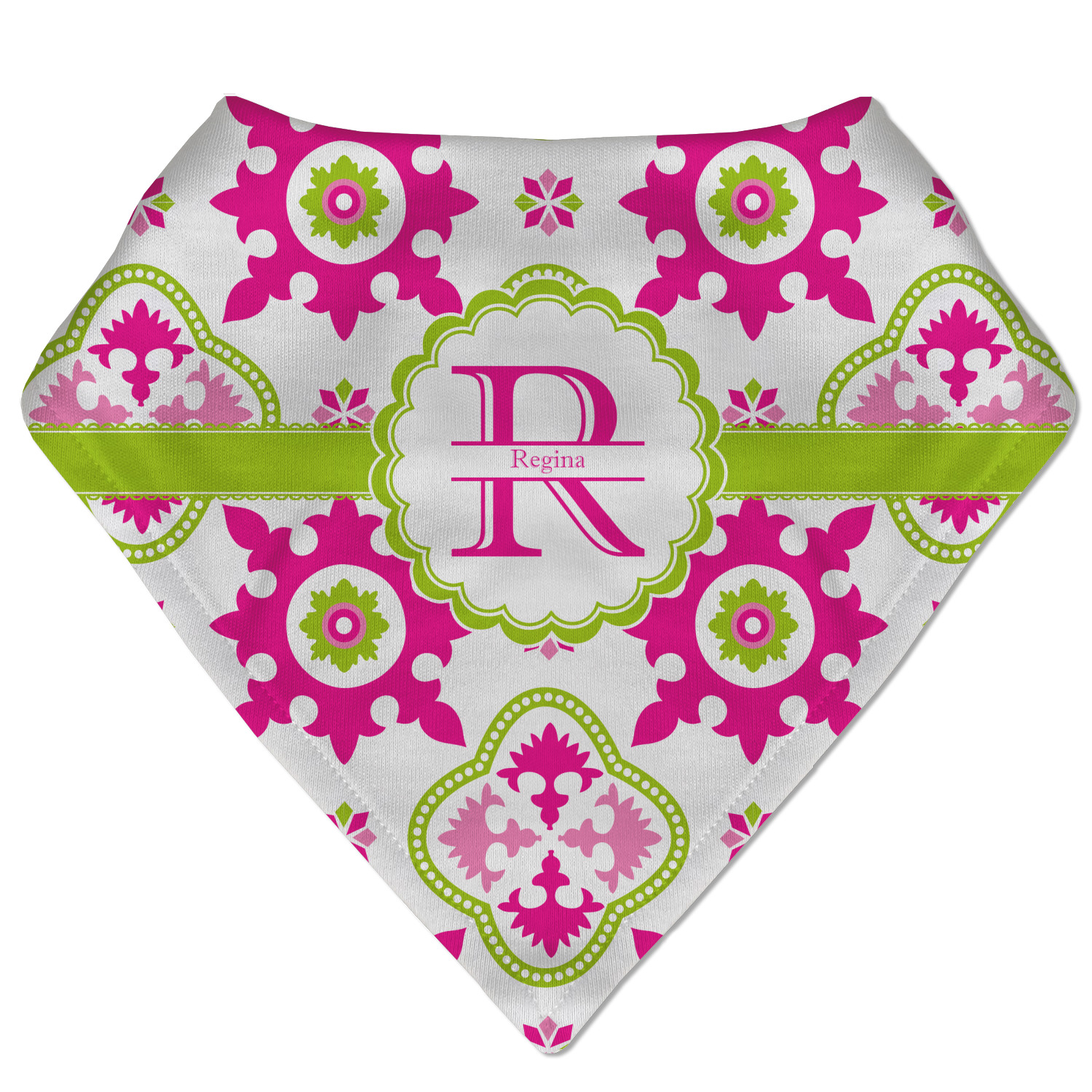 Looking for a girly girl design? This pink and green floral print with a scalloped label is as girly as it gets. We have created this intricate flower pattern in lime green, orchid pink and hot pink. For all of us girly girls and princesses, this is our first choice!