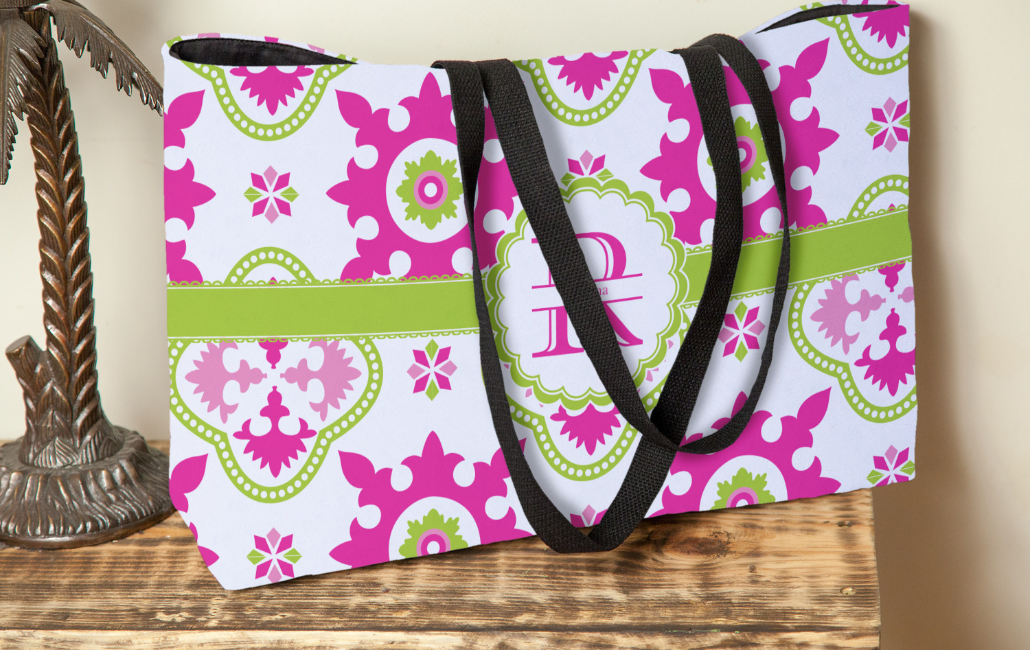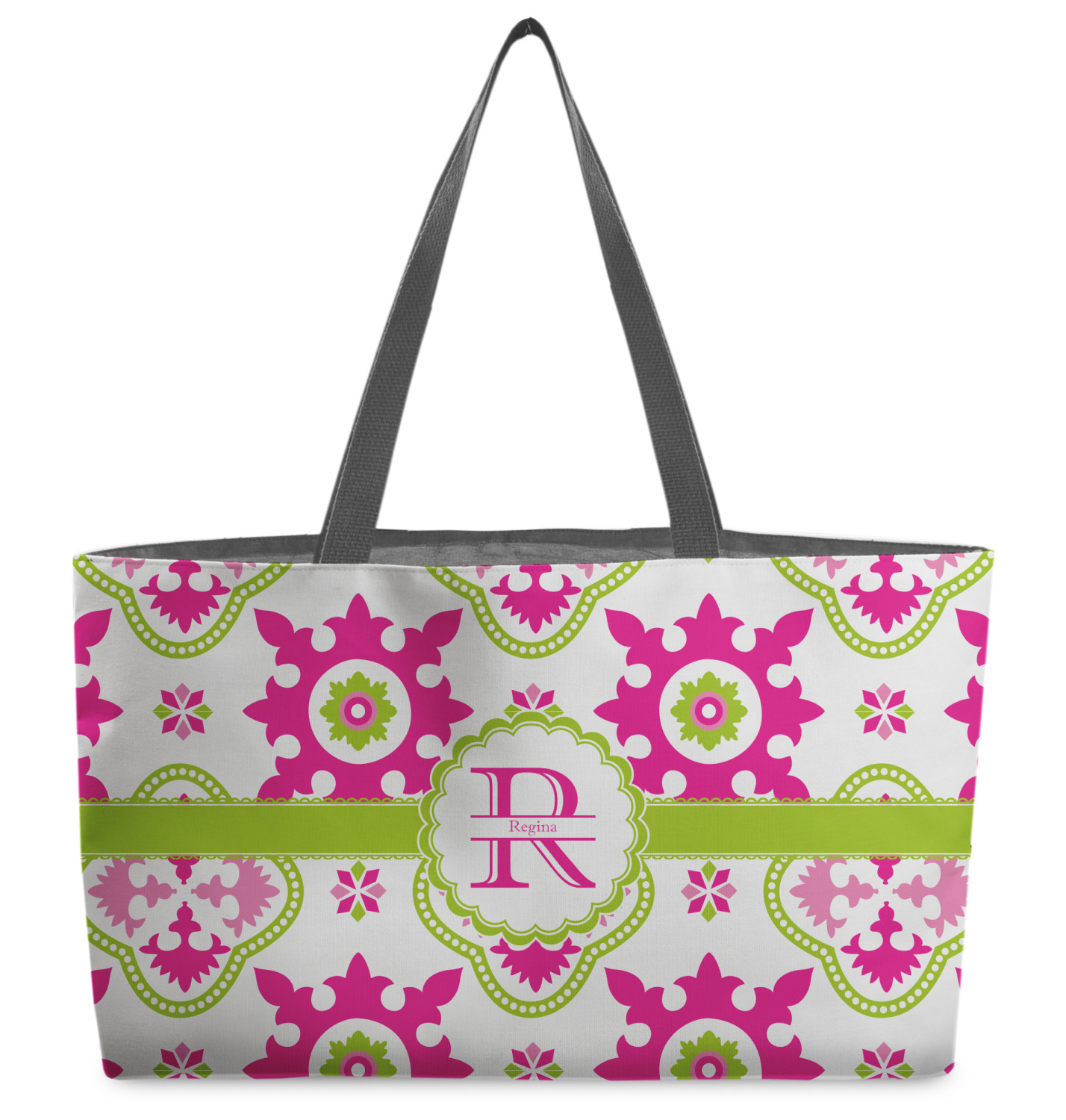 These beach totes are handmade here in the USA. Fabric is printed with your design. The tote is then sewn from the fabric pieces, lining and handles added.