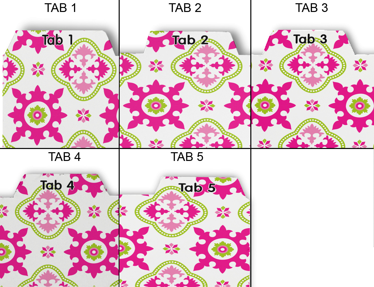 Whether you use binders at school or at work, we have designs to suit all of them. Available in 5 or 6 tab sets, you are sure to find a set to suit your needs. The back of each one is white and can be used to take notes, write vital information on, etc.