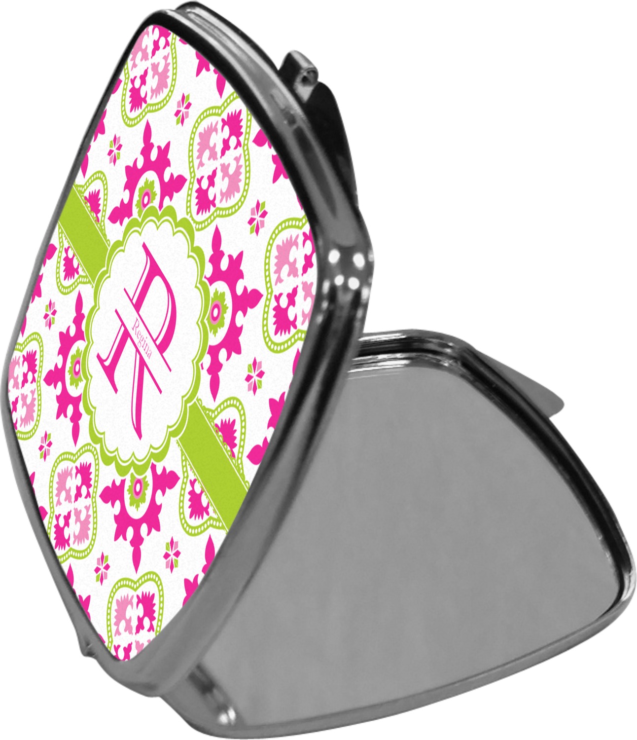 Our compact mirrors are customized with your design on one side. The other side is patterned silver tone metal. Inside, there are two mirrors.