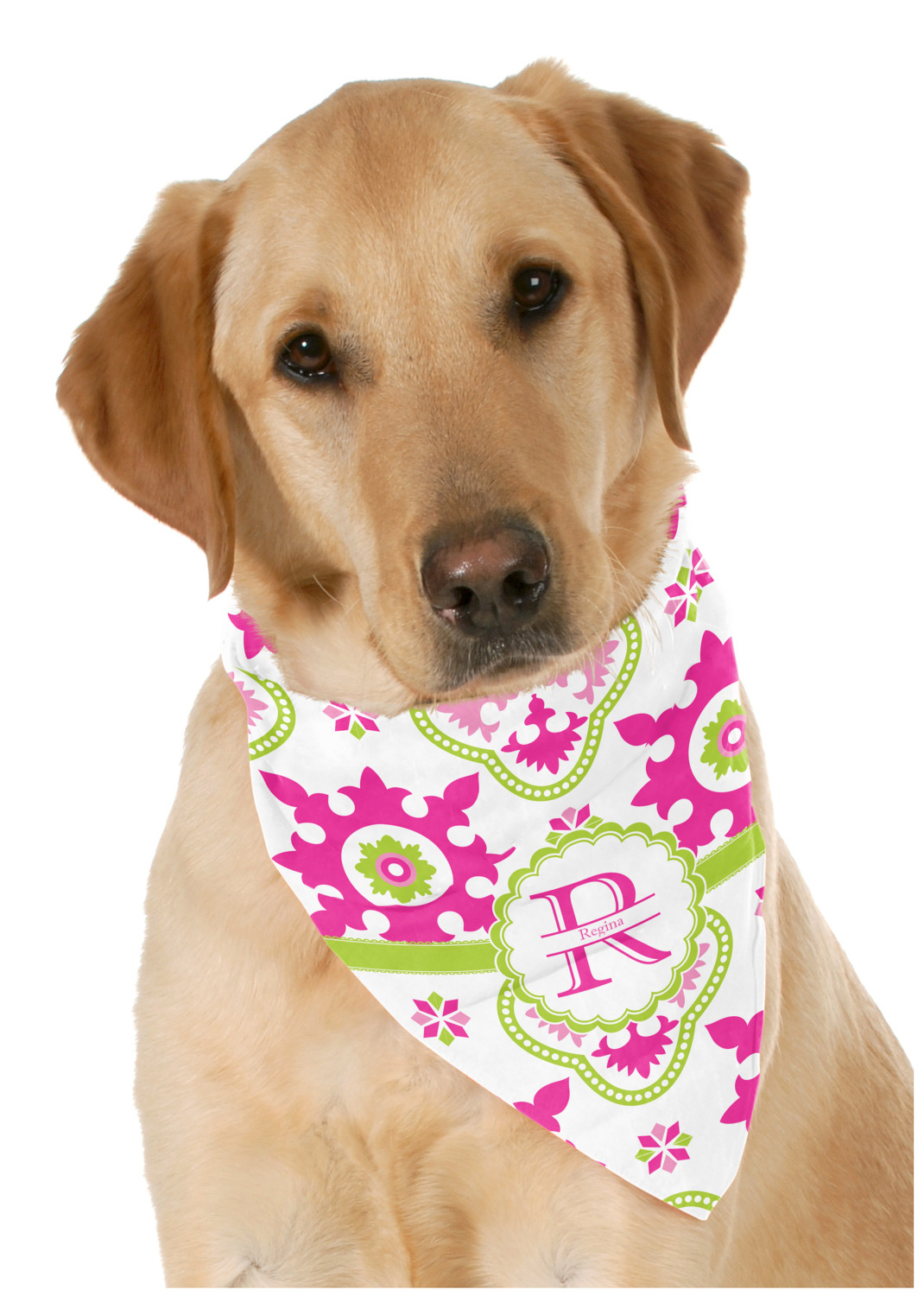This beautiful pet bandana really is the perfect accessory. It is made from a silky feeling polyester and measures at approximately 23" x 23". Your personalization will be printed on a diagonal, so that you are able to read the personalization when folded into a triangle. This bandana fits best on large dogs, but can be folded smaller if there is no personalized text to fit smaller pets.