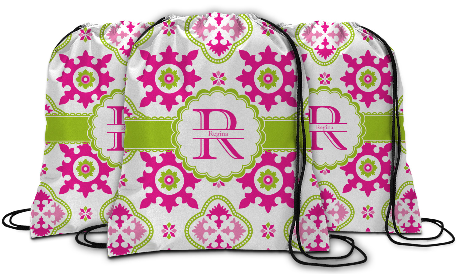Our drawstring backpacks are custom made for you here in the USA. We offer a great selection of cinch bags and it is your choice to personalize them with the text of your choice, in the format of your choice i.e. monogram, name, initial, name & initial. We offer many different patterns and prints; and many of the patterns are available in 45 different colors.