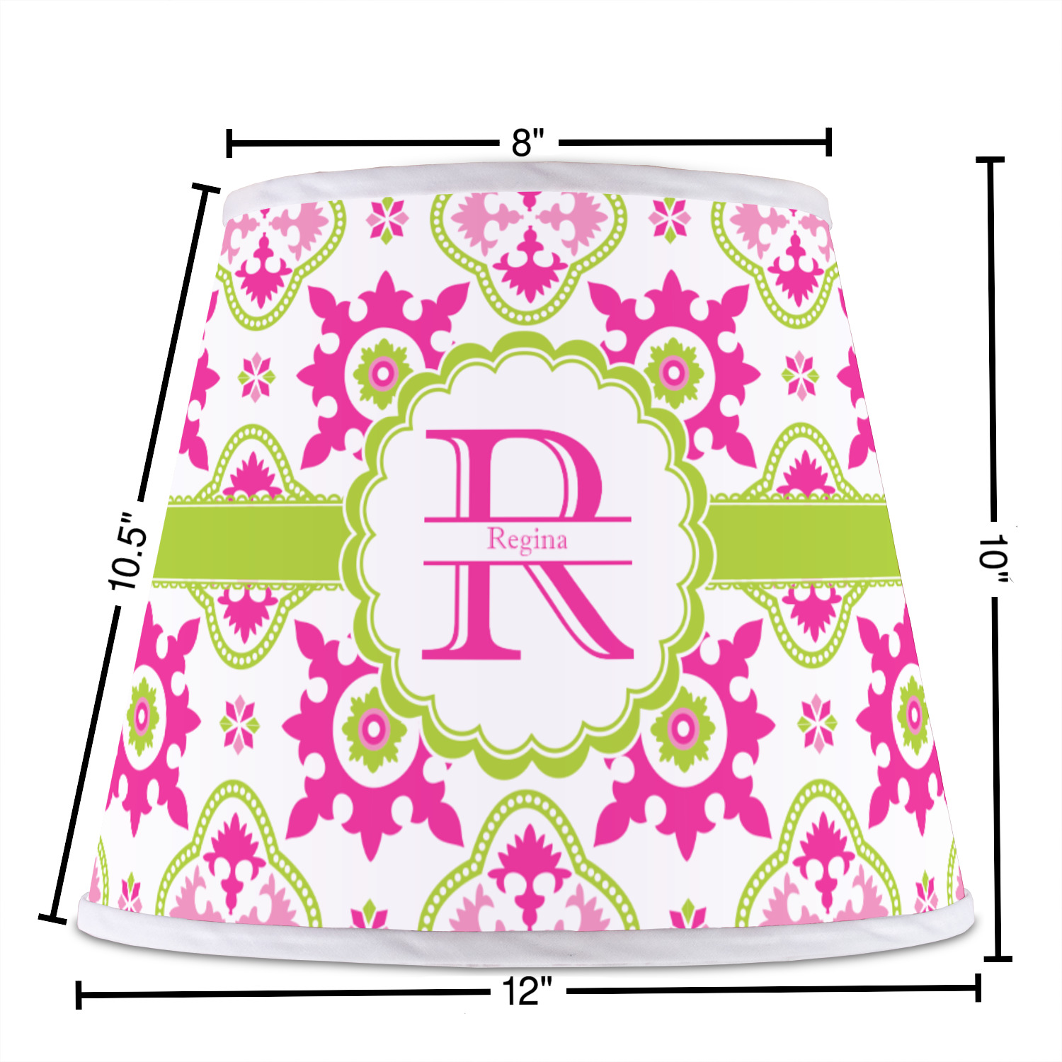 The base of this lampshade is 12 inches in diameter, and the top spans 8 inches in diameter. The total height of the lampshade is 10 inches. The angled nature of this custom lampshade concentrates the light, making it ideal for smaller spaces. This lampshade is made of matte, polyfilm, and displays your customization in its middle. The top and bottom of this colorful lamp shade are lined with a white fabric ribbon (which can be replaced with black inside the design studio) which frames your design and creates a sophisticated finish. As an UNO fitter lampshade, this unique lamp shade will fit a variety of bases.