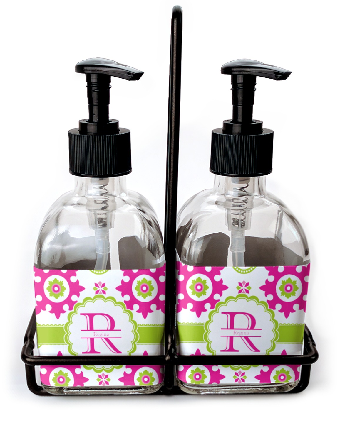 You can purchase these personalized soap dispensers as singulars, or as a set with two bottles. With your purchase of the set, we include a black frame that complements the black color of the pumps and adds to the overall classy look of the piece.