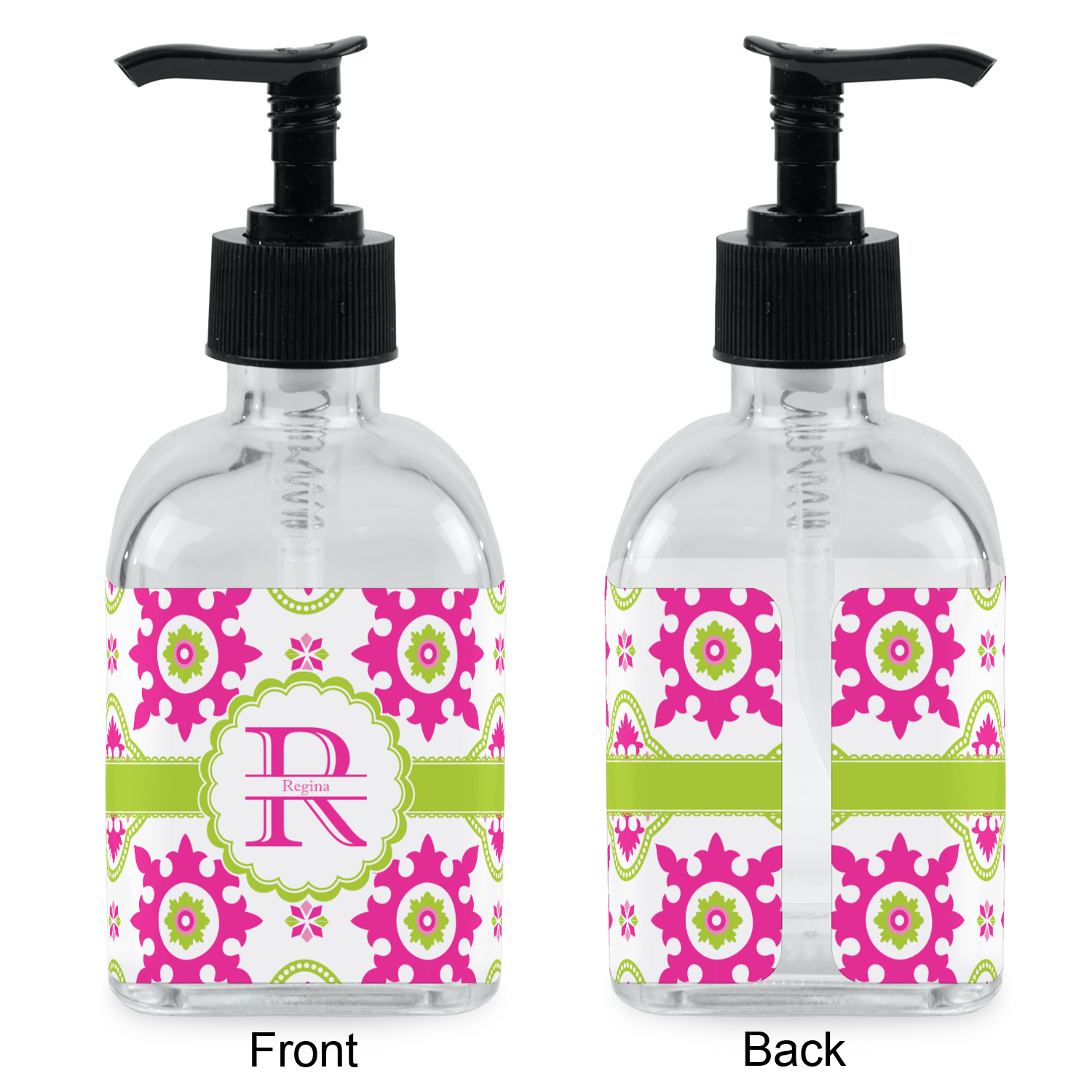Crafted from a high-quality glass, these soap dispensers and lotion dispensers are durable and robust, while still looking elegant. They are sold with black pumps. Each soap dispenser pump measures at 6.5 by 2.25 inches. On these soap pumps, we display your customized design on a personalized vinyl adhesive on three sides. That way, you can judge how much liquid is in the bottles from the back.