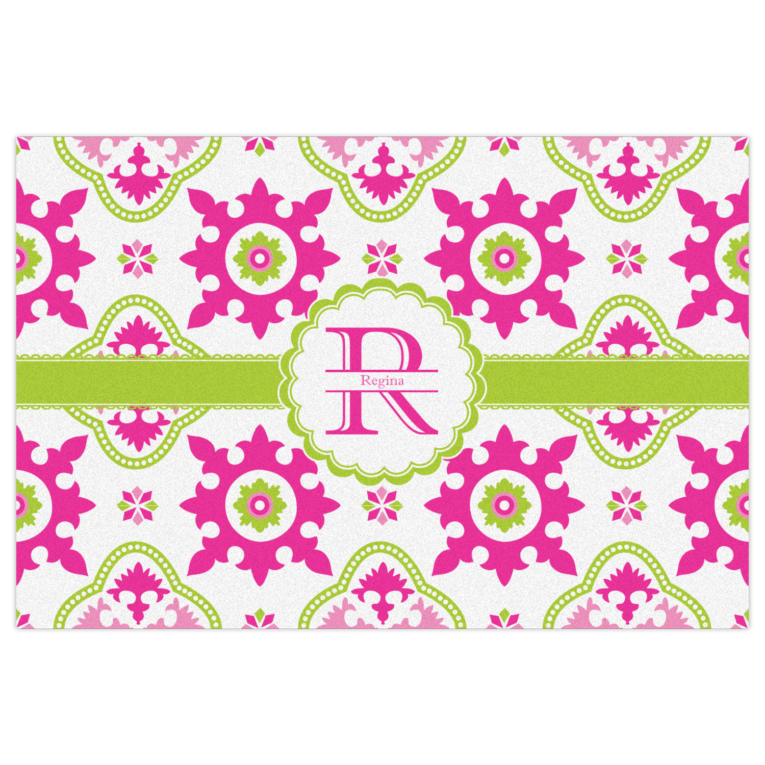 Looking for a girly girl design? This pink and green floral print with a scalloped label is as girly as it gets. We have created this intricate flower pattern in lime green, orchid pink and hot pink. For all of us girly girls and princesses, this is our first choice!