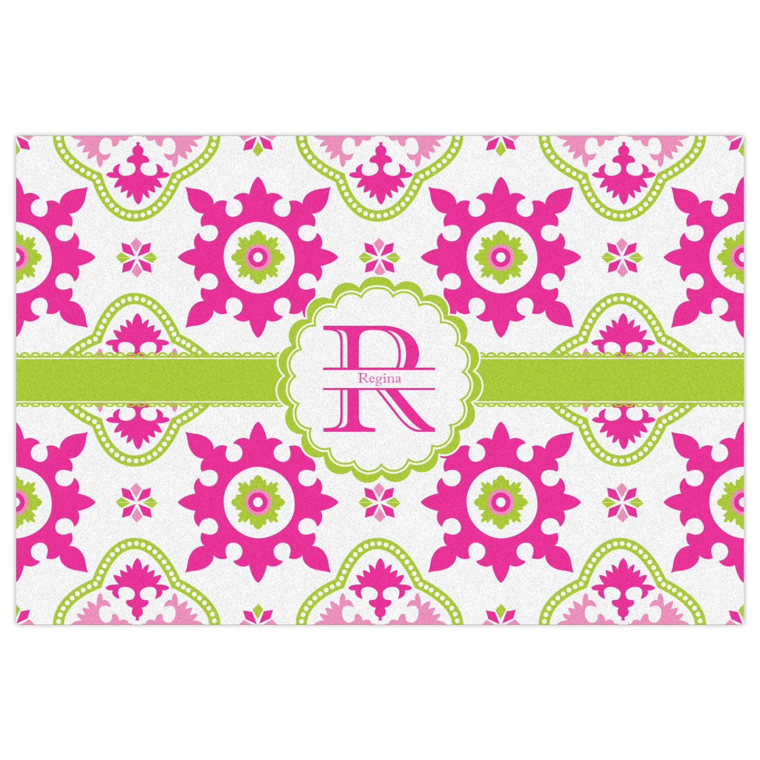Looking for a girly girl design? This pink and green floral print with a scalloped label is as girly as it gets. We have created this intricate flower pattern in lime green, orchid pink and hot pink. For all of us girly girls and princesses, this is our first choice!