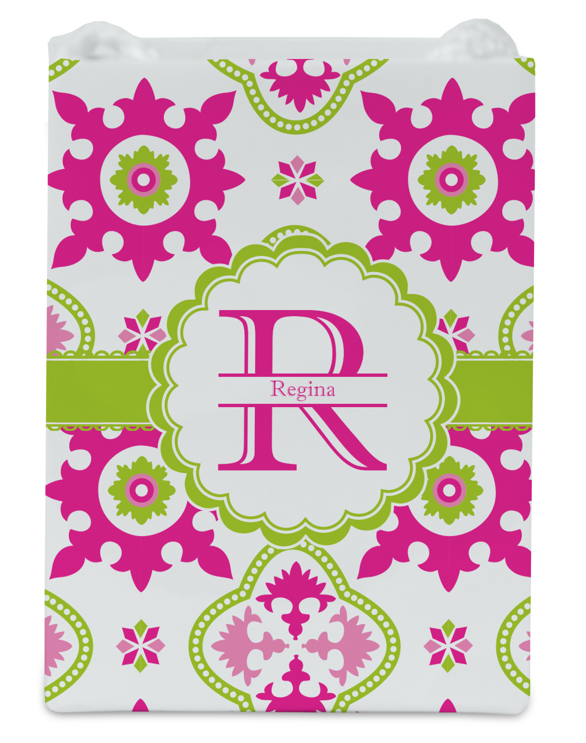 Looking for a girly girl design? This pink and green floral print with a scalloped label is as girly as it gets. We have created this intricate flower pattern in lime green, orchid pink and hot pink. For all of us girly girls and princesses, this is our first choice!