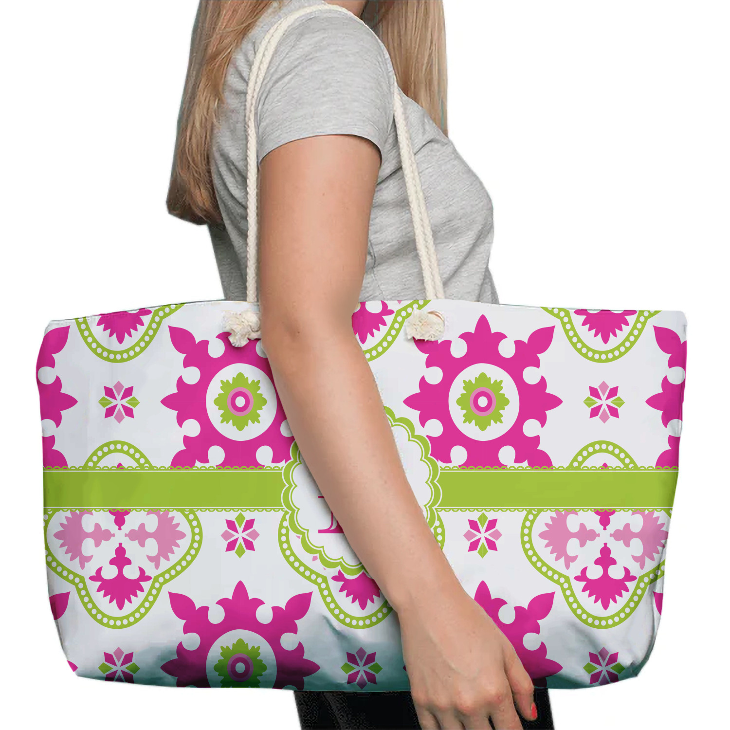 Our oversized weekender tote with rope handles is perfect for your weekend at the beach or on the town. This large tote are 24" W X 13" H, with a 5" gusset and a 27" thick rope handles with a knot that is put through a grommeted brass hole.