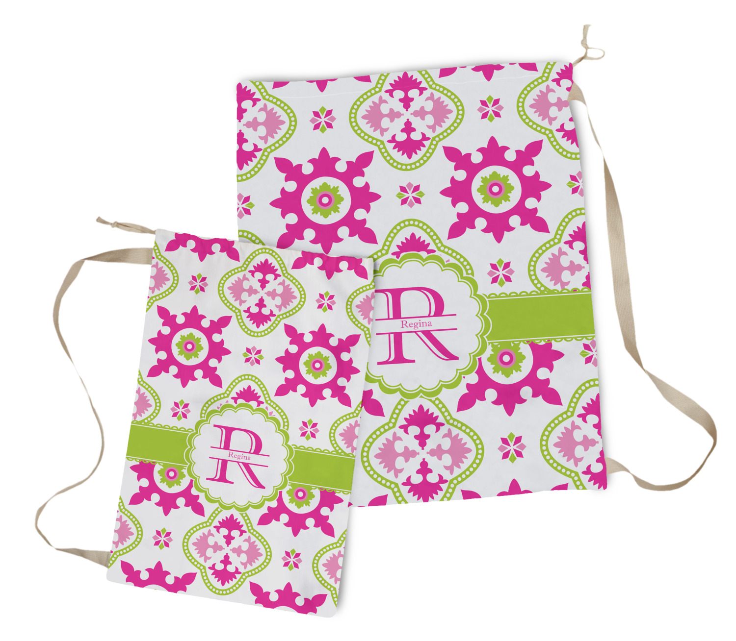 Carry your laundry in style with these customized laundry bags. Available in two sizes, featuring a natural colored woven strap and a cinch cord, these bags hold a lot of clothes or anything else you want to fit in them.