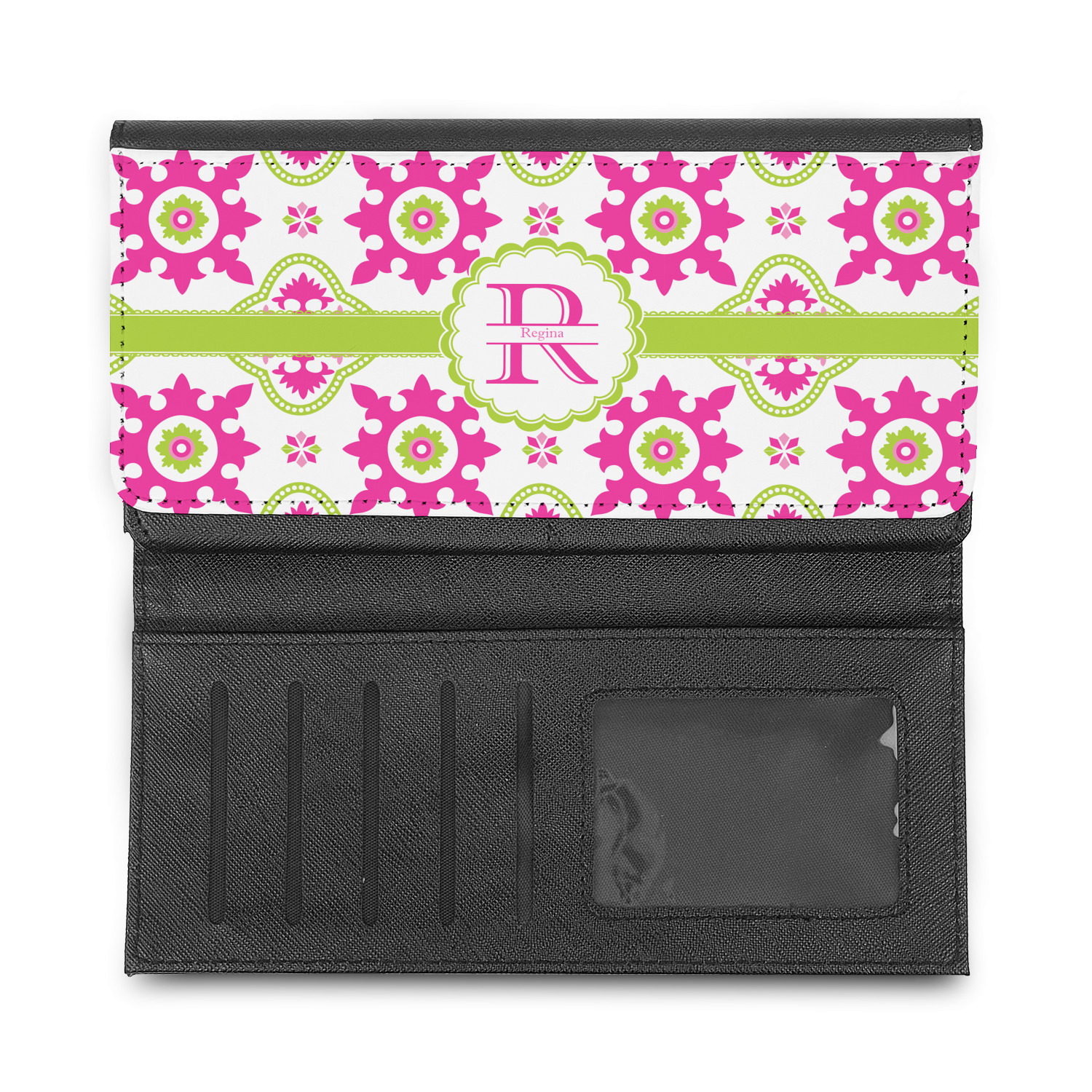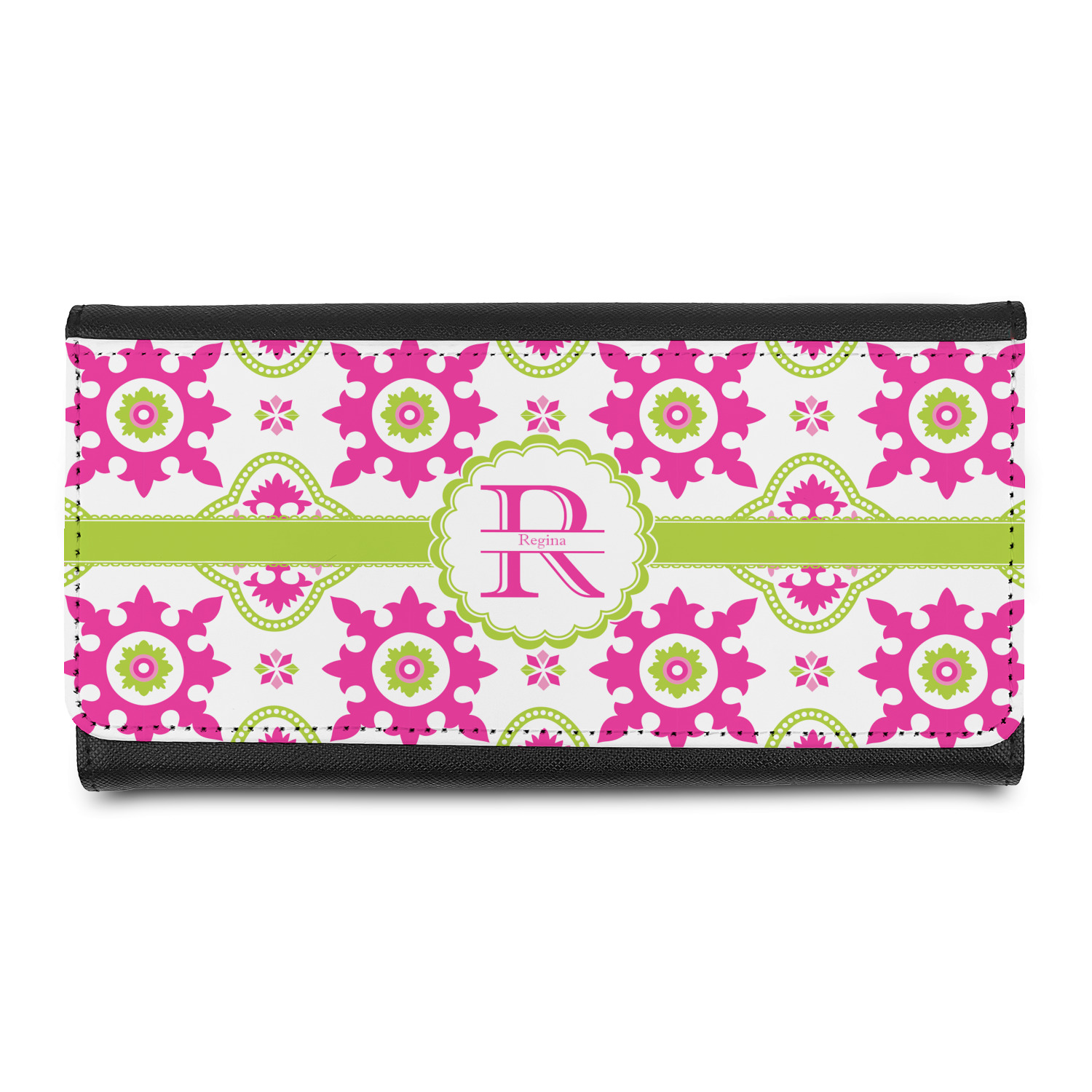 These leatherette ladies wallets can be customized with any one of our patterns (many patterns are available in multiple colors). Of course adding personalization (free) is your choice - you can include a monogram (interlocking is my favorite), a name, or one of our beautiful name and initial combinations.