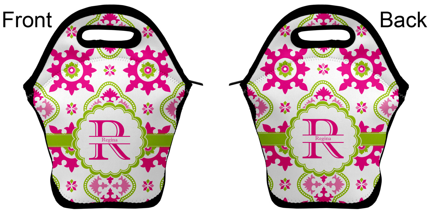Our personalized lunch bags are made from a strong neoprene, and secure with a zipper closure that lines the top of the bag.The edges of the neoprene are sewn together with a heavy duty stitch, adding to the durability of the bag. The is accompanied by a reinforced handle at its top, for the easy transport of your lunch. We display your personalization across both the front and back of this neoprene lunch bag, while the remaining sides are a sleek black in color. Each bag measures at 13.5 inches tall, and 11.5 inches wide.