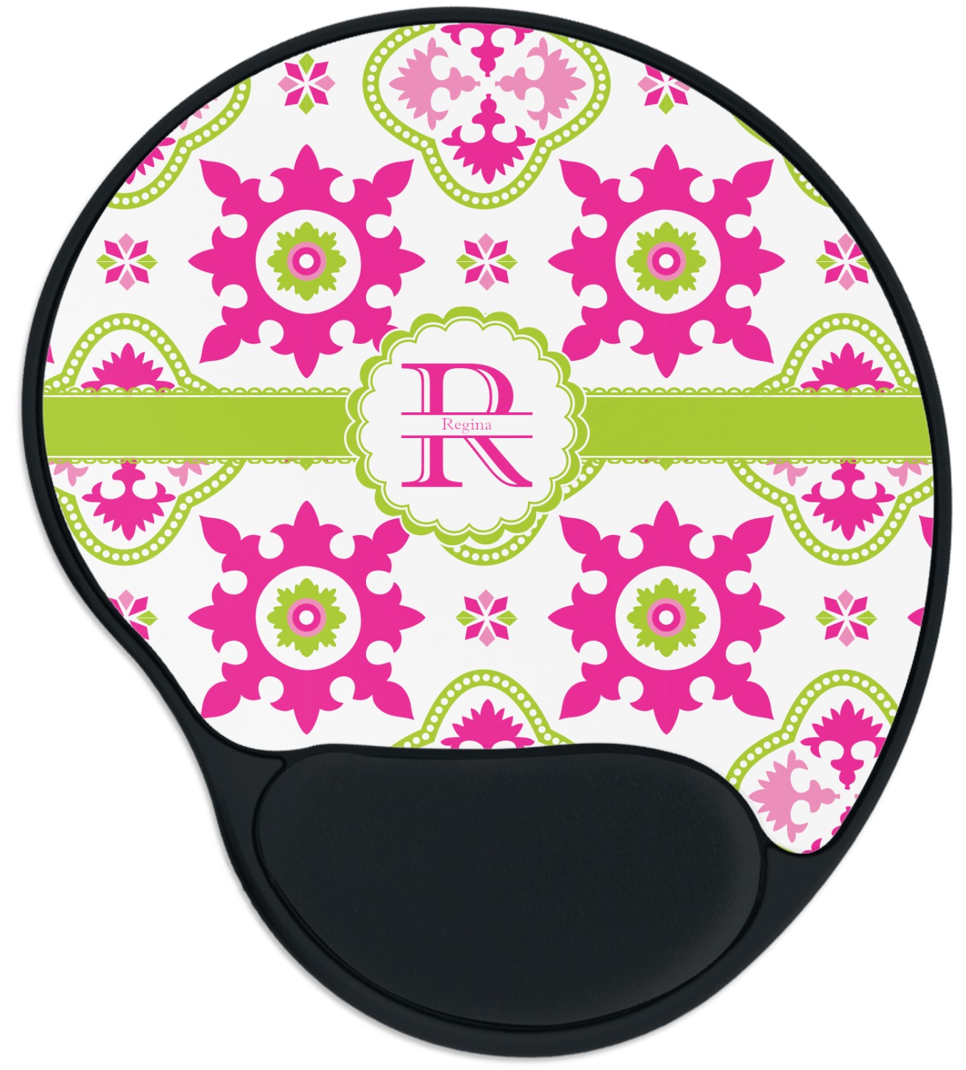 The top of these personalized mouse pads are made from a polyester, while the underside is plastic. The back of these mouse mats include rubber feet to prevent any slippage while in use. A padded wrist support, made from plush memory foam, occupies the bottom section of these computer mouse pads. Your customized design is printed onto the face of this mat, with the remaining sides and support piece colored in black. The mat itself is rounded and measures at 10.25" x 9.13".