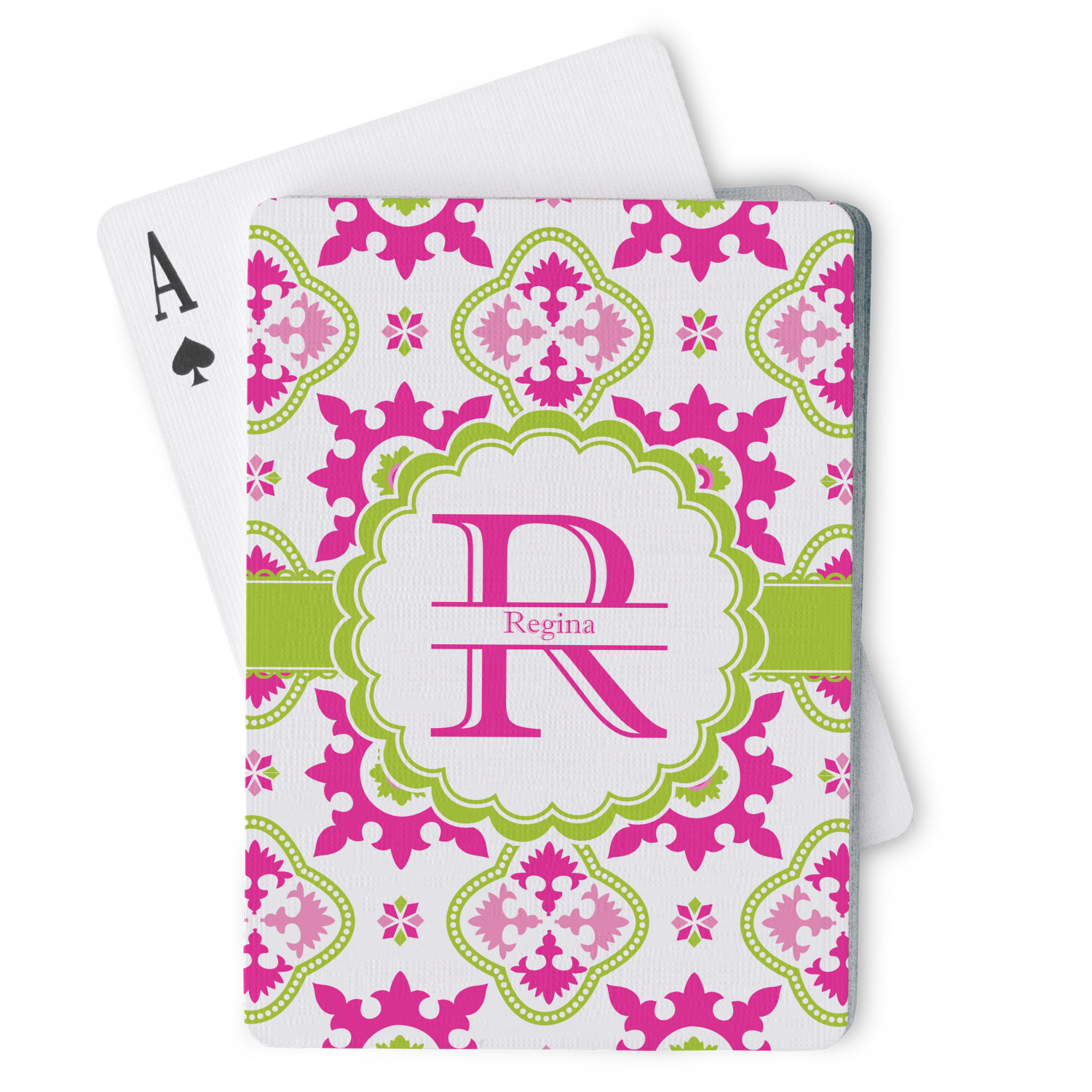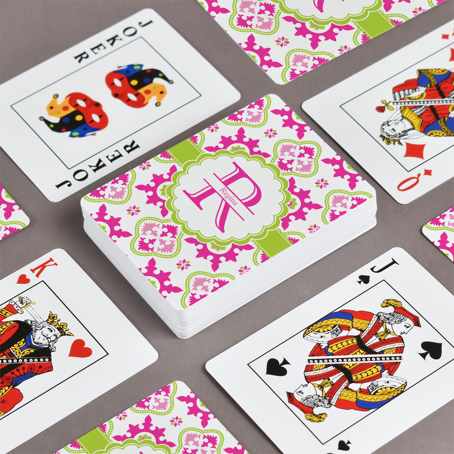 The customization / personalization is printed on the back side. The playing cards have a low gloss coating on both sides. The cards are packaged in a clear plastic box.