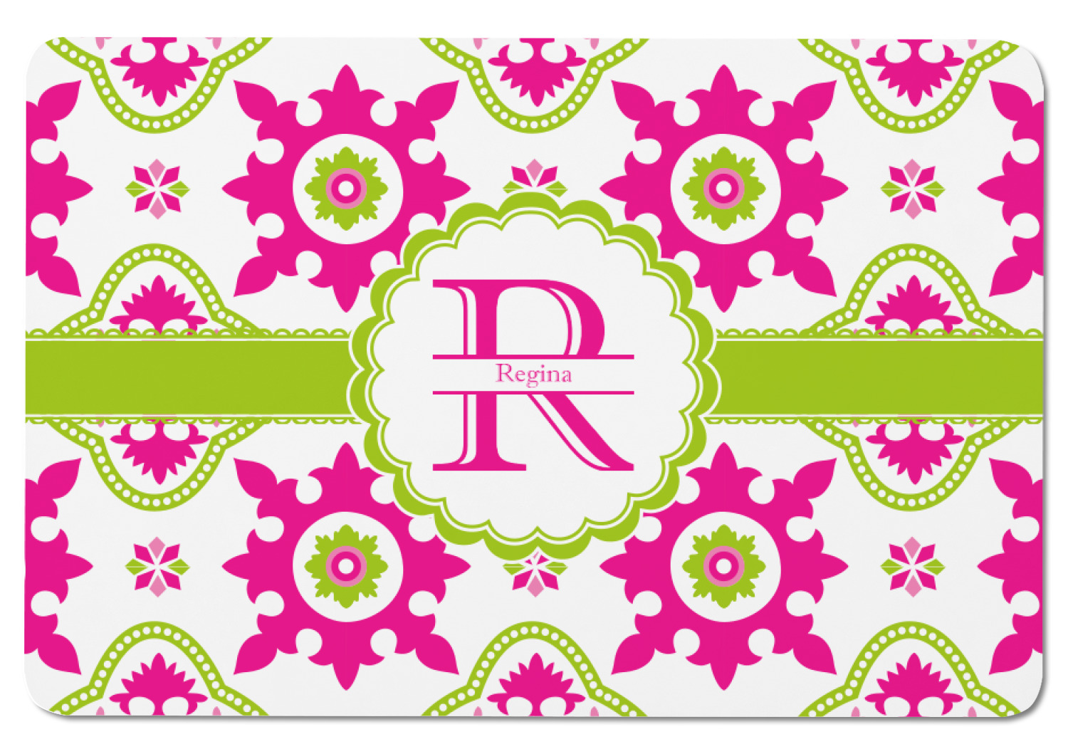Looking for a girly girl design? This pink and green floral print with a scalloped label is as girly as it gets. We have created this intricate flower pattern in lime green, orchid pink and hot pink. For all of us girly girls and princesses, this is our first choice!