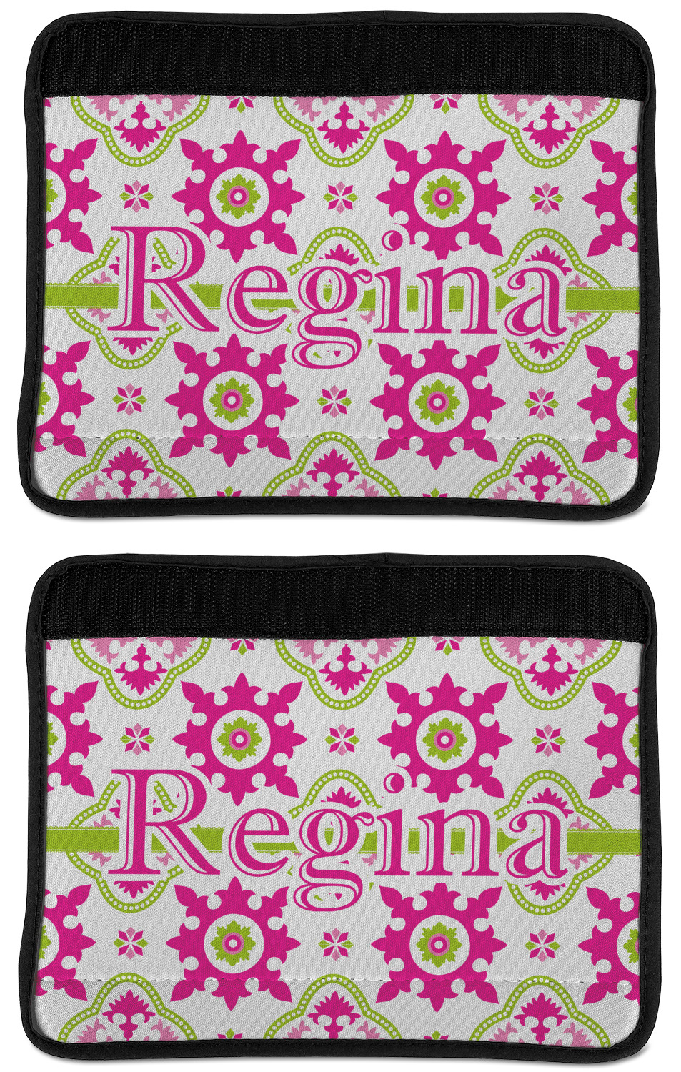 Made from neoprene, our seat belt strap covers wrap around the belt itself and have a Velcro tab for easy attachment and closure. The belt's edges are trimmed with a black polyester for a secure finish. Each cover is 9.5 by 7 inches when open and 9.5 by 2.5 inches when closed. We print your personalized design on the face of the seat belt pad.