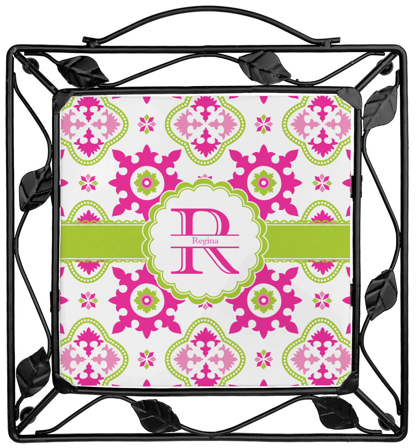 Our square trivets are made from a durable, wrought iron. This model features 4 small half circles, one on each corner, and a larger ring of iron that circles the central, customized tile. Each of the 4 corners has a round foot on its bottom for stability. This trivet is 8.75 by 8.75 inches, but the central tile measures at 6 inches on both sides.