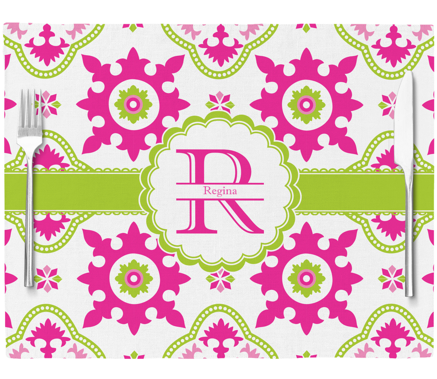Each of our table mats are a poly twill material with woven burlap detailing. This creates a soft, quality placemat for us to fully print your personalized design across. The woven twill also adds a wrinkle-free surface to set your table! Each customizable placemat is a rectangle shape measuring at approximately 13 x 18 and printed here in the USA.