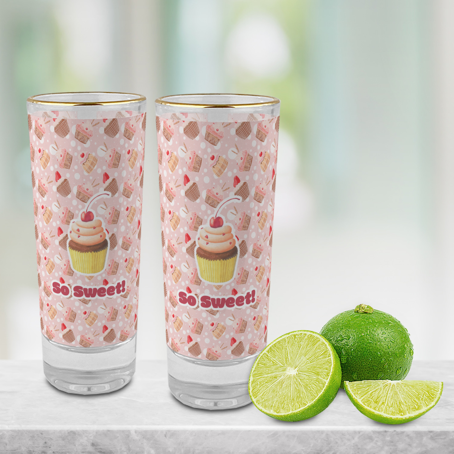 These glass shooter glasses are printed in full color with the design of your choice. These are a tall shooter 2 oz size and stand 4" tall. The print is a full wrap design to boldly display your personalization.