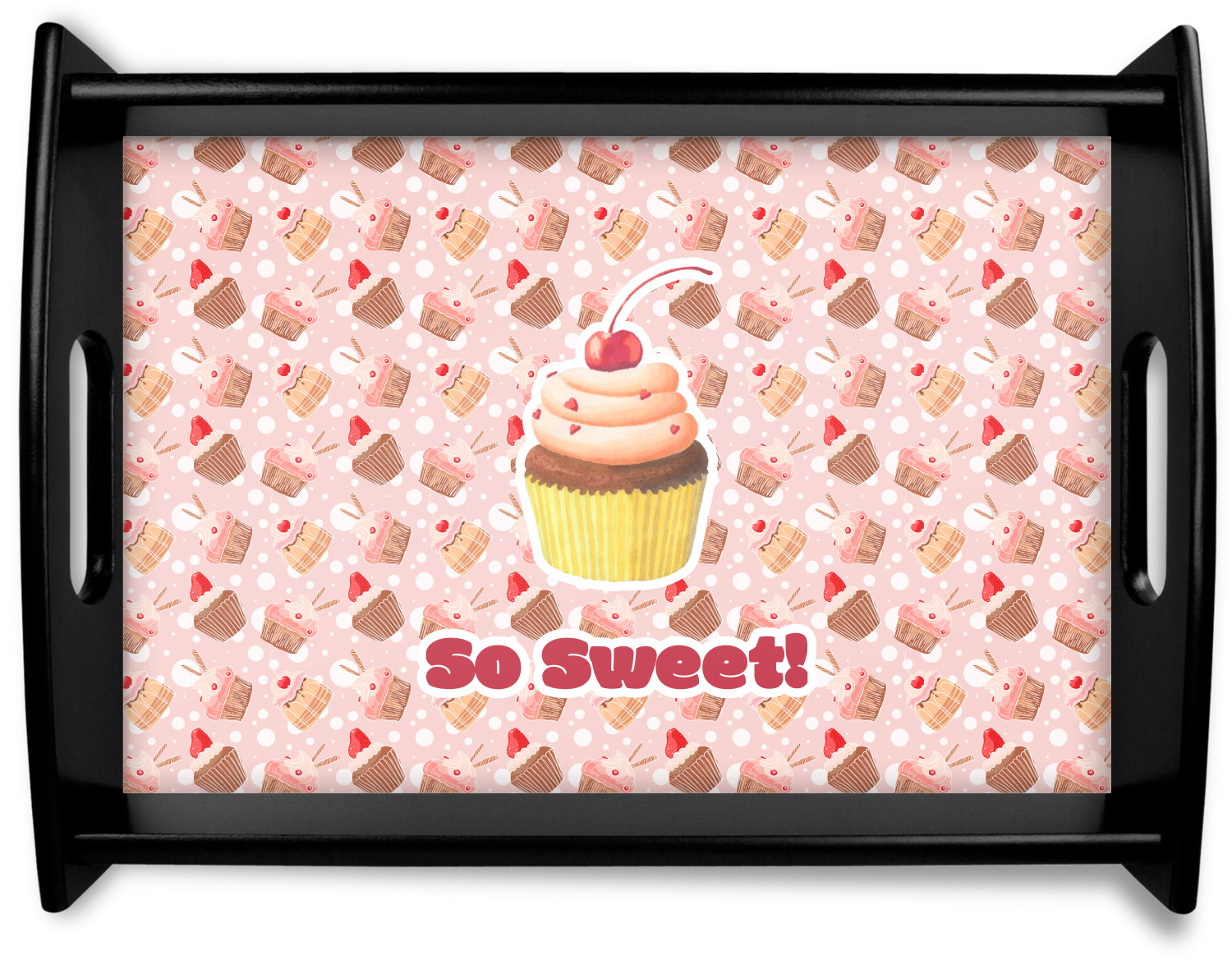 This serving tray with handles features square edges and two rounded sides, creating a very modern look. Each side is fabricated from a beautifully cut, natural wood. The bottom of the interior of the tray displays your customized design in bright, vibrant color. The tray is sold in both a black color and a natural wood look. Each variation of the wood serving tray has two sizes: Small, which is 14" x 10" x 2.25", and Large, which is 19.5" x 13.5" x 2.75".