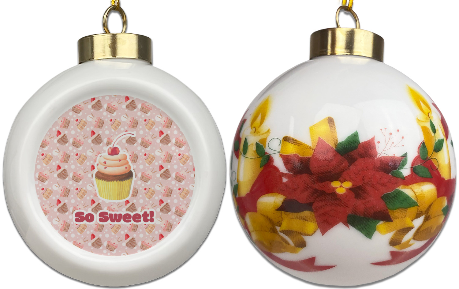 Our Christmas ornaments are a unique ceramic ball shape with a twist as it has a flat face to display your custom design! Select from one of our two design types - Christmas Tree or Poinsettia Garland - to adorn the curved back of your personal design. Each ornament measures 3H x 2.5W x 2D accompanied with a gold string accent for finishing touches to hang on your beautiful Christmas tree!