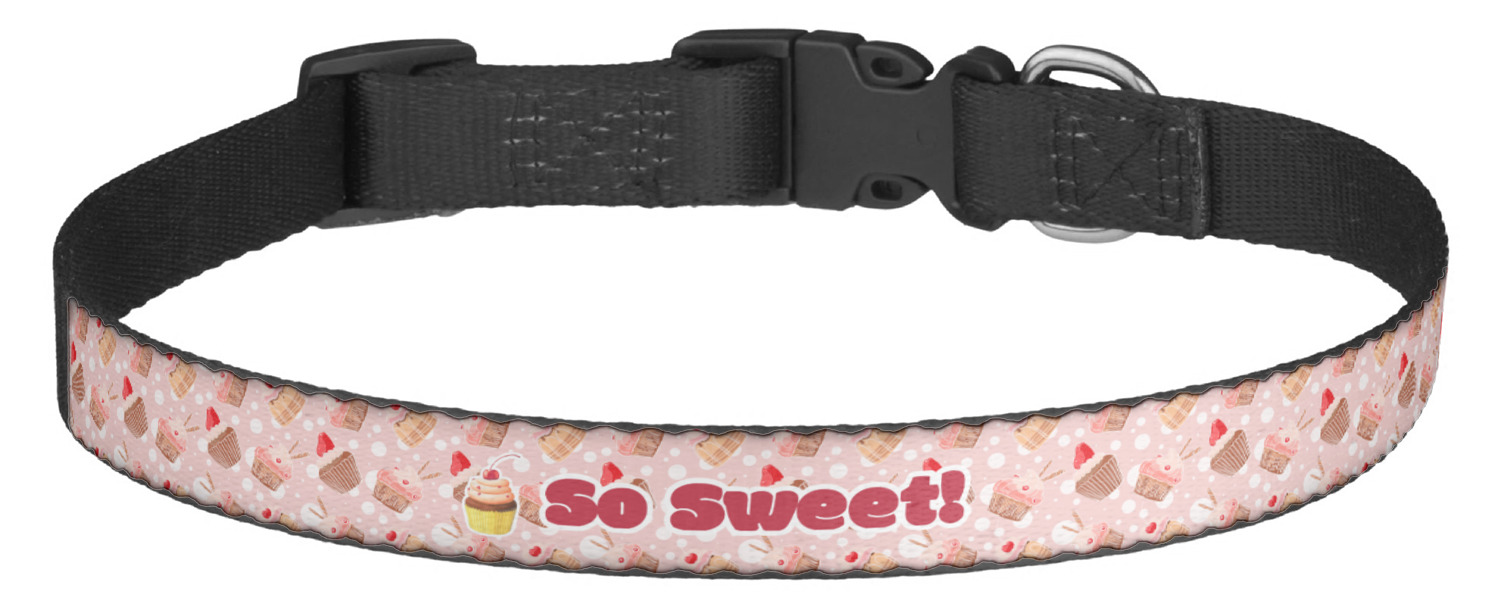 This sturdy collar, made from a durable nylon weave, will outlive your dog's episodes of excited tugging and pulling. Courtesy of its thick plastic buckle and adjuster, this collar is adjustable and accommodating of any dog. Structurally, the collar is a single piece of nylon weave that is sewn together, and features a solid metal loop where you can attach a leash or dog tag. We print and display your dog's name and pattern across the middle of the personalized dog collar.