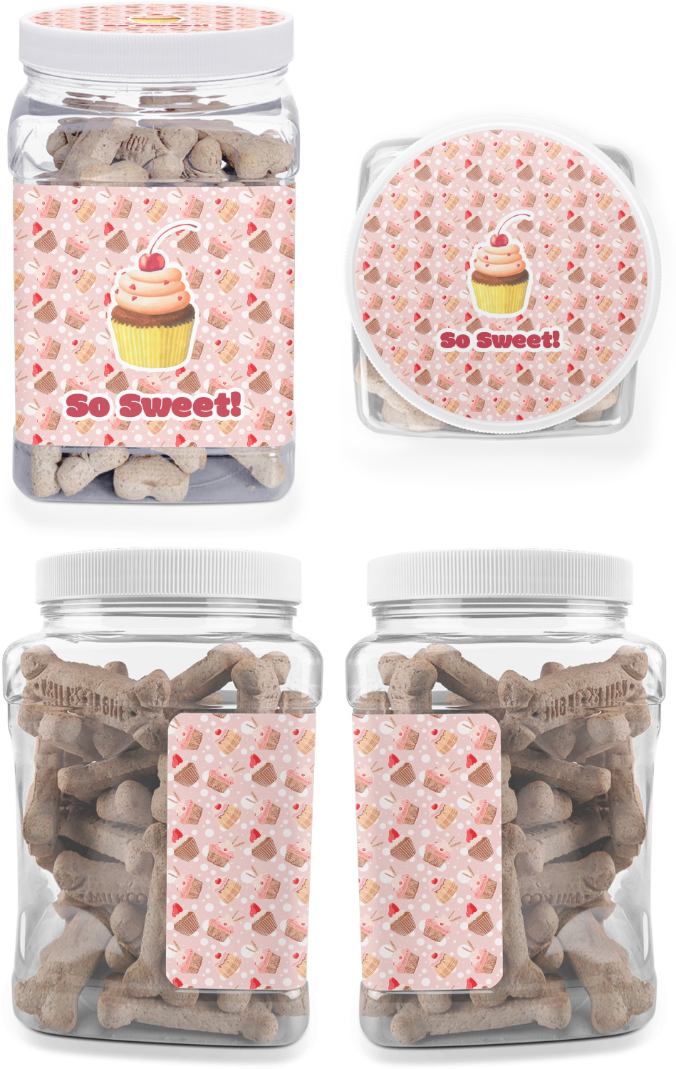 This half gallon jar, made from a sturdy plastic, is the perfect way to keep treats from any naughty pet paws, while still keeping them ready on hand for when your pup performs an impressive trick. This dog cookie jar features a screw-on, white lid that displays your personalized design on a vinyl sticker. We apply another customized sticker that wraps around the front and sides of the jar. Our dog treat jar also has indentations on the rear ends of the sides, which allows for convenient handling, and its square frame allows for easy storage.