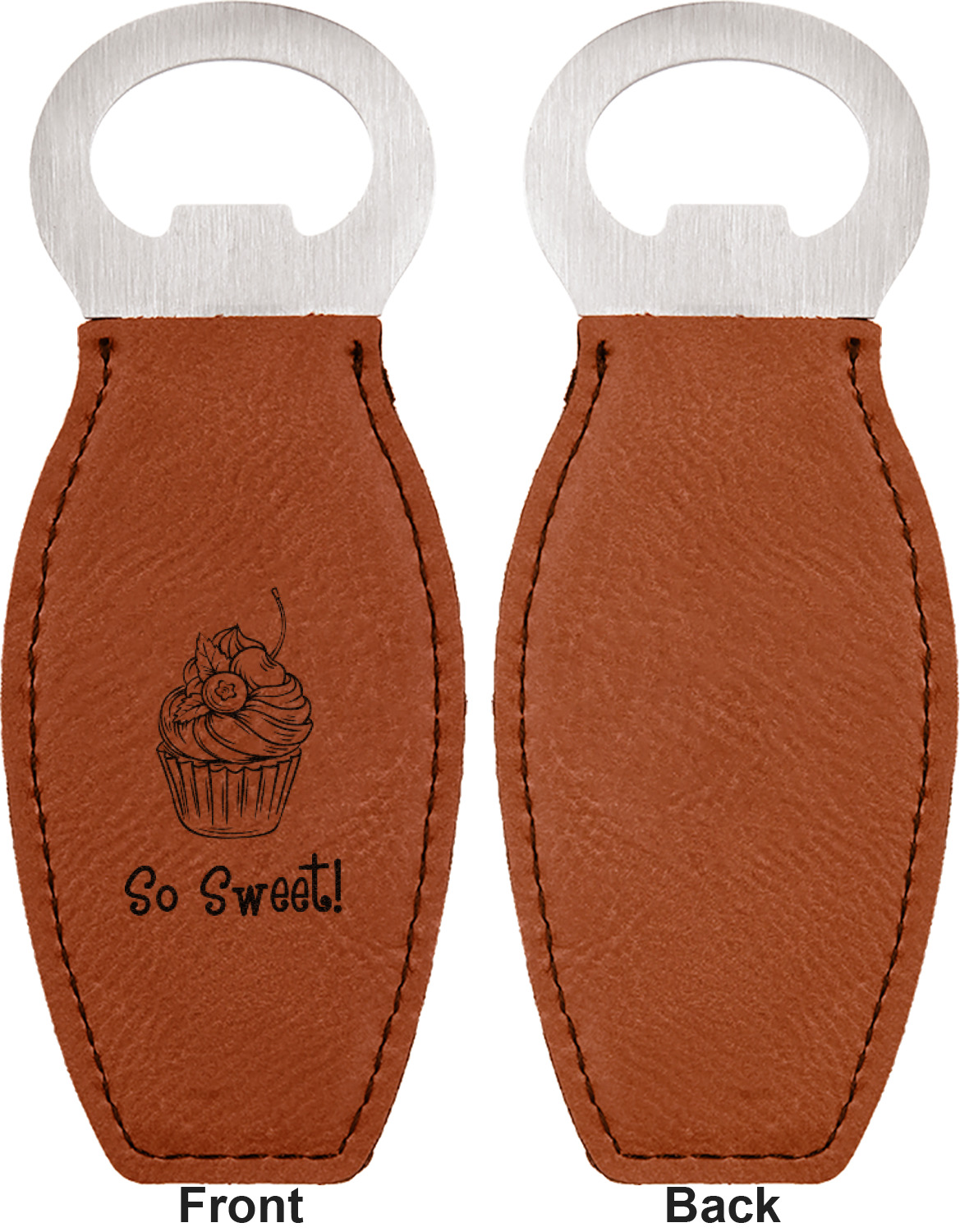 Built from stainless steel, these custom bottle openers are wrapped in a cognac-colored leatherette. Sharp, black stitching lines the edges for extra durability and a finished touch. Your personalization is laser-engraved onto the surface of this leatherette, leaving behind a crisp, black coloration. At 4.6 by 1.8 inches, this beer bottle opener gives you much of leverage when trying to open a stubborn bottle. On the opposite end of the opener, you'll find a magnet that you can use to display your new, unique bottle opener!
