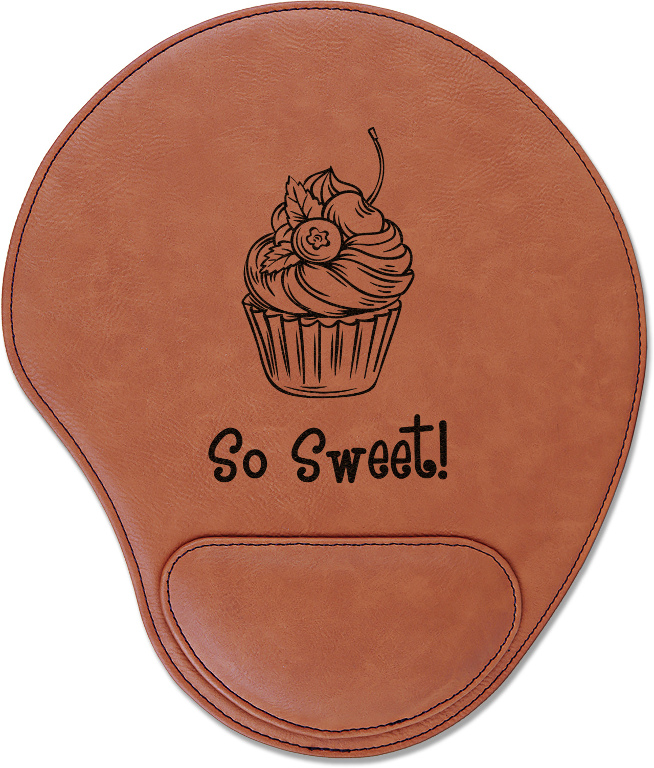 In a rounded shape, this mouse pad is made of a luxurious, cognac-colored leatherette. The nature of this material allows your mouse to glide smoothly across its surface. Strong stitching lines the edges to guarantee stability and strength. As added support for tired wrists, your personalized mouse pad features a supportive wrist rest at its bottom. This model measures at 10.25" x 9", while its wrist pad is approximately 5" x 2.75", with a thickness of 0.75". Your personalized design is laser engraved into the front face of this mouse pad.