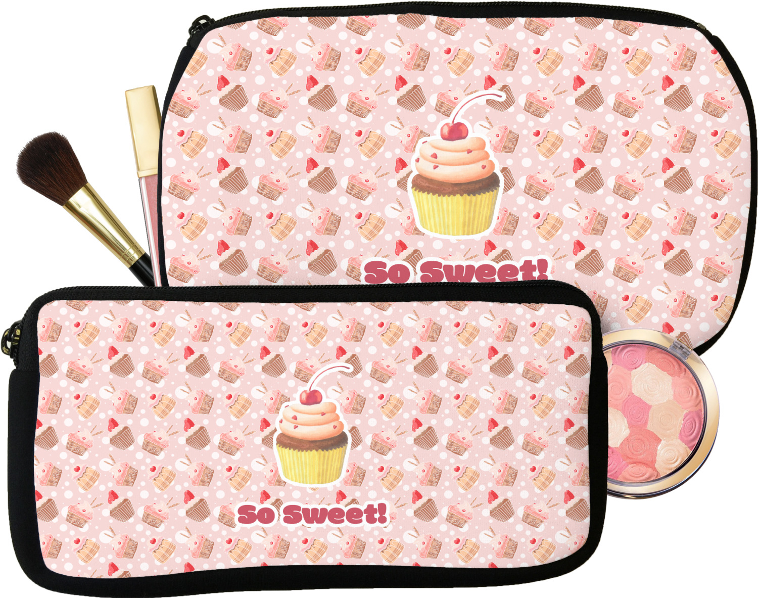 Our personalized makeup bags are available in many different designs, patterns and colors - so you are sure to find one that will love. They are made of neoprene (same material as wet-suits) and thus are water resistant, so spillages in your makeup bag will not end up all over you purse. They are customized on one side and are black on the other side and the zipper is black as well.