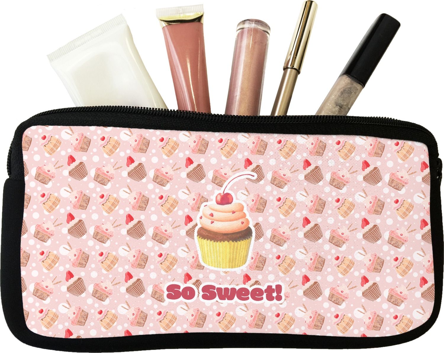 Our personalized makeup bags are available in many different designs, patterns and colors - so you are sure to find one that will love. They are made of neoprene (same material as wet-suits) and thus are water resistant, so spillages in your makeup bag will not end up all over you purse. They are customized on one side and are black on the other side and the zipper is black as well.