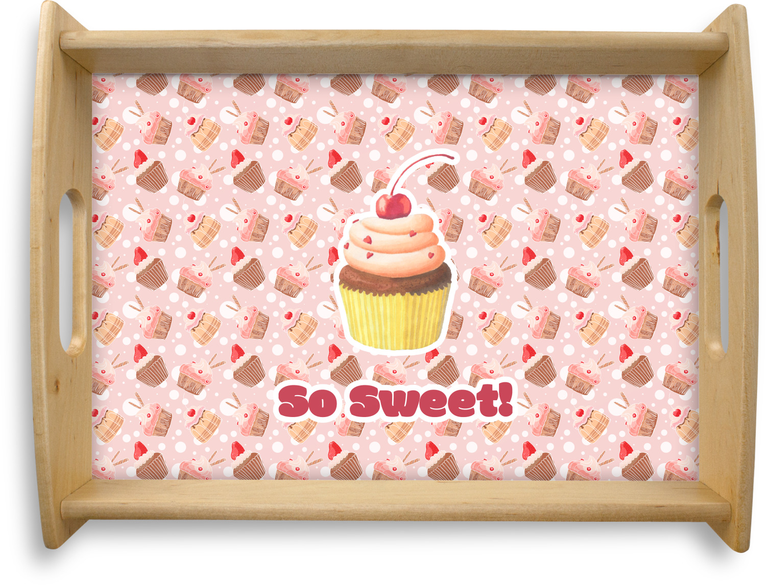This serving tray with handles features square edges and two rounded sides, creating a very modern look. Each side is fabricated from a beautifully cut, natural wood. The bottom of the interior of the tray displays your customized design in bright, vibrant color. The tray is sold in both a black color and a natural wood look. Each variation of the wood serving tray has two sizes: Small, which is 14" x 10" x 2.25", and Large, which is 19.5" x 13.5" x 2.75".