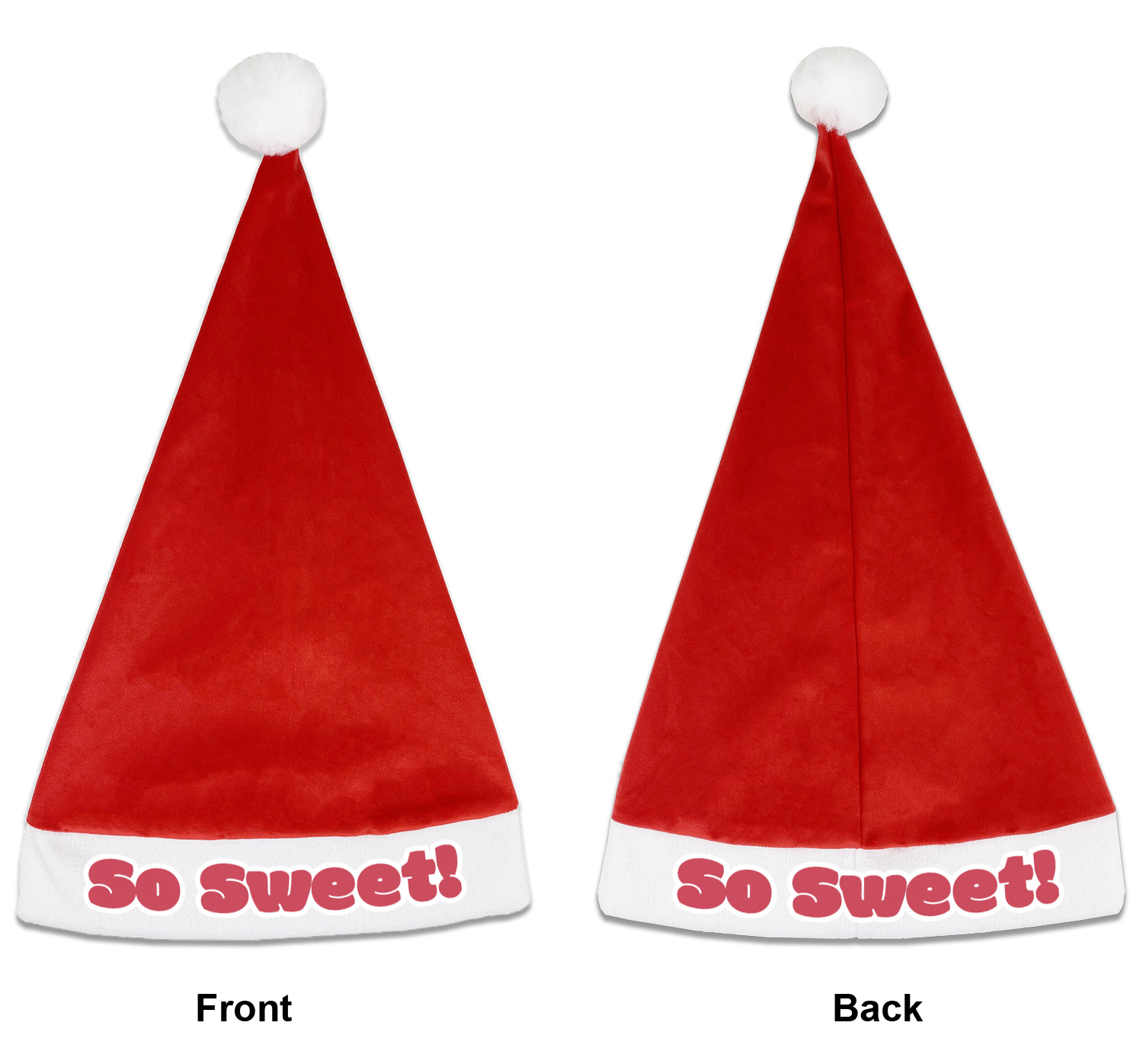 Our Santa hats are a soft, velvety polyester material. These customizable Santa hats are a classic red with white brimming and pom pom ball hanging off the hat tail just like Santa Claus! Each personalized Santa hat is approximately 17.5 L x 11.8 W. We offer two different styles to print your designs on the white brim - front or front & back.