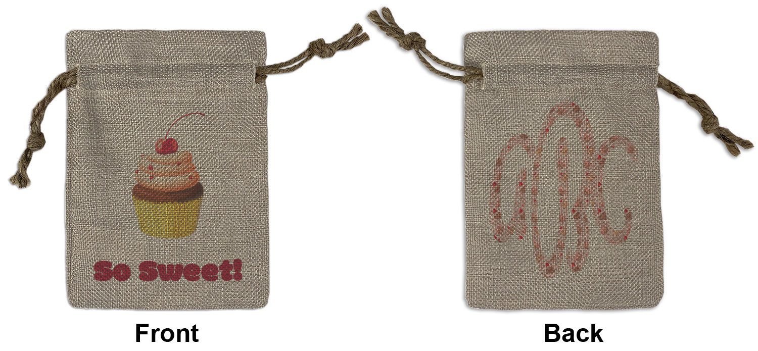 We sell our Burlap Gift Bags in 3 variant sized bags. Made with burlap polyester, each personalized bag can be secured with a twine drawstring pull. Your custom design is available to print on one side or both sides - completely up to you! The sizes of the bags measure approximately 4.5" x 6.5" for the smallest size, 6.5" x 8.0" for the medium size, and 6.5" x 13.5" for the large-sized bag.
