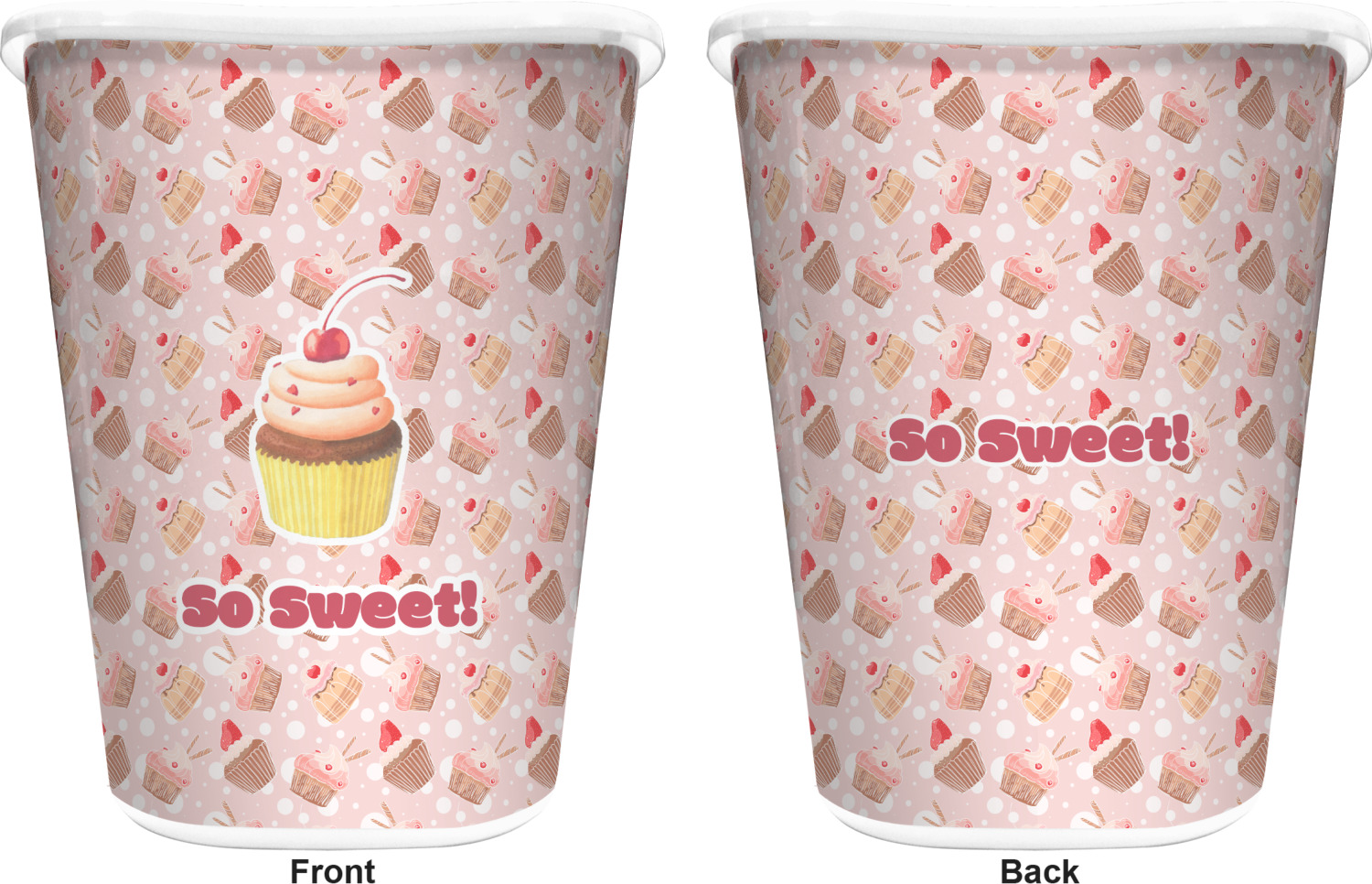 You can choose to purchase these decorative wastebaskets in either a white or a black color that will show on the base and the upper rim. Your customization is printed on a high-gloss, fine-quality vinyl adhesive, and you can choose to either have this adhesive applied to one side only or to both sides. As such, this plastic wastebasket can be single-sided or double-sided, depending on your creative vision. Your customization is printed using durable inks, making the design waterproof and resistant to fading over time.