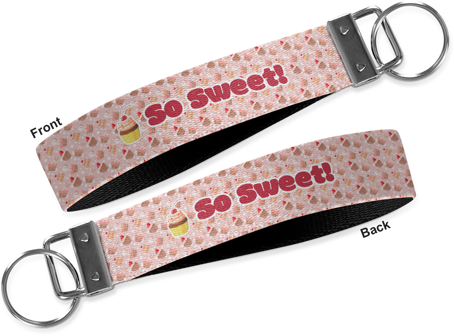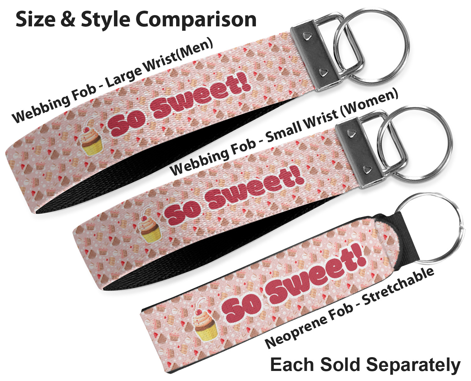 These key fob keychains are made from a polyester weave, right here in the USA. They feature a silver, metal clasp, attached to a round keyring. The piece gives the personalized wristlet a beautiful, finished look. Your customized design is printed on the outside of the keychain strap. We carry these wristlets in two sizes: small, which is 5 inches in width, and large, which is 5.5 inches in width.