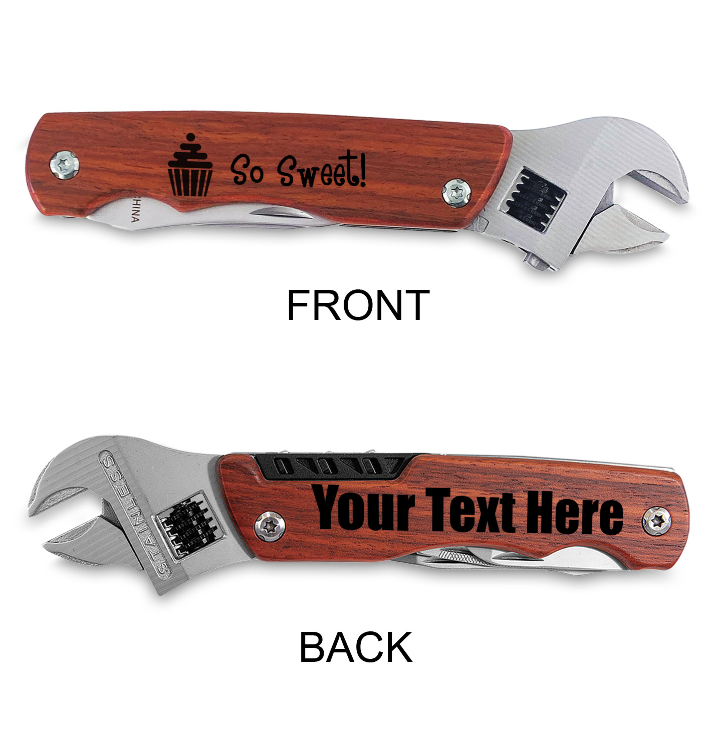 The wrench multi-tool has a knife, file, bottle and can opener, screwdriver, hex nut wrench and an adjustable wrench. The rosewood handle can be laser engraved on one or both sides to your liking to add that special personal touch for the user. Includes a black fabric pouch with belt loop for storage. Also includes white gift box.