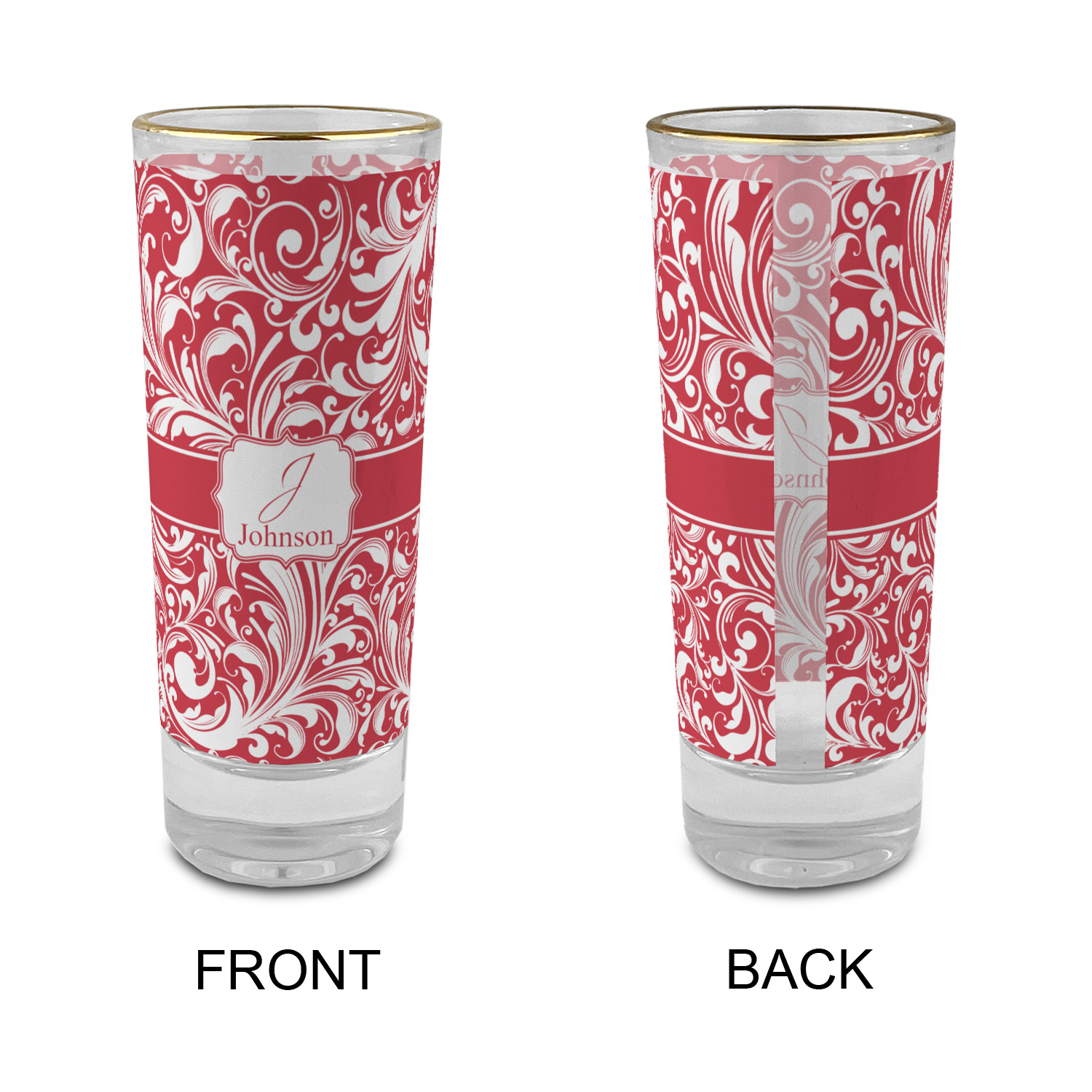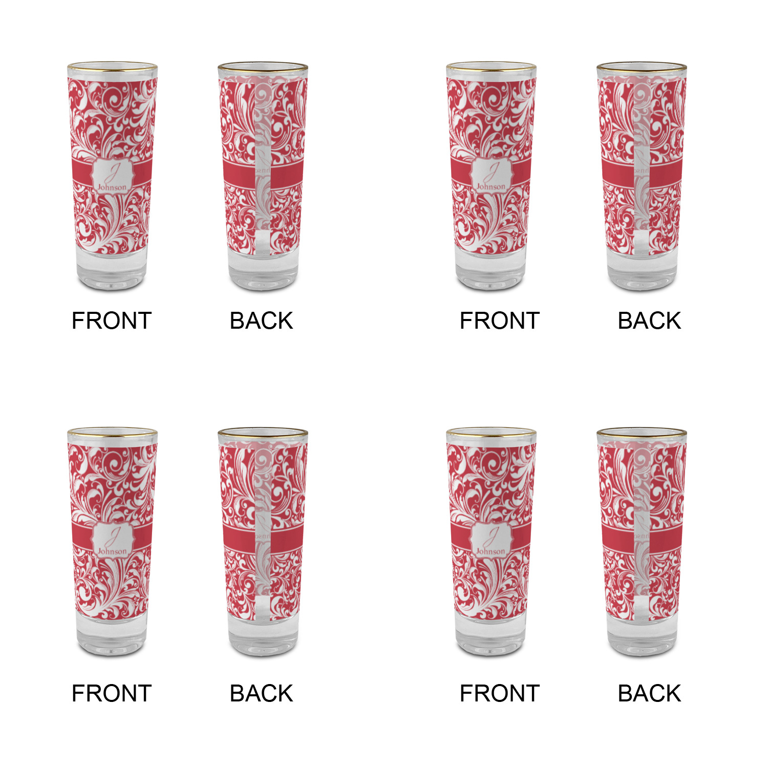 These glass shooter glasses are printed in full color with the design of your choice. These are a tall shooter 2 oz size and stand 4" tall. The print is a full wrap design to boldly display your personalization.