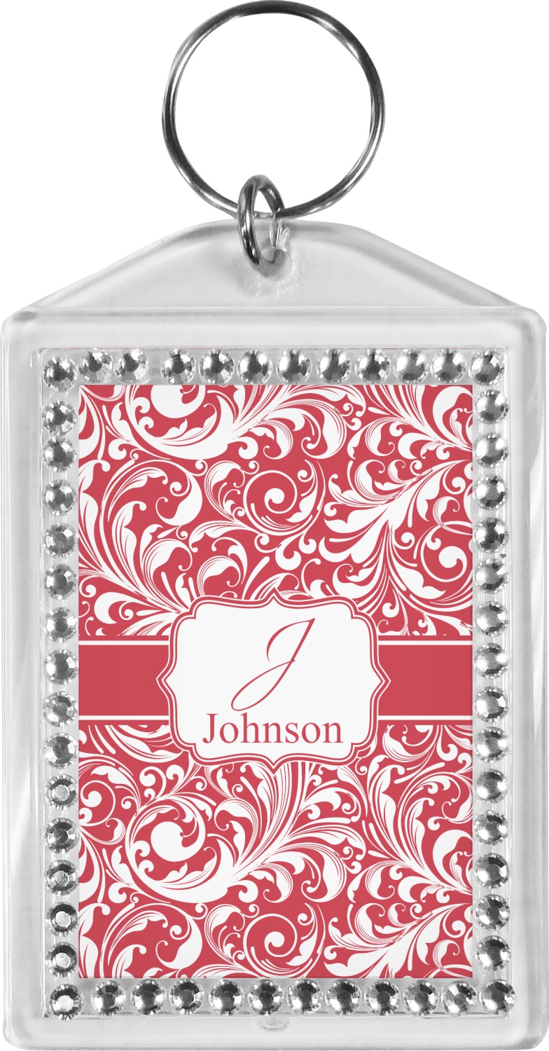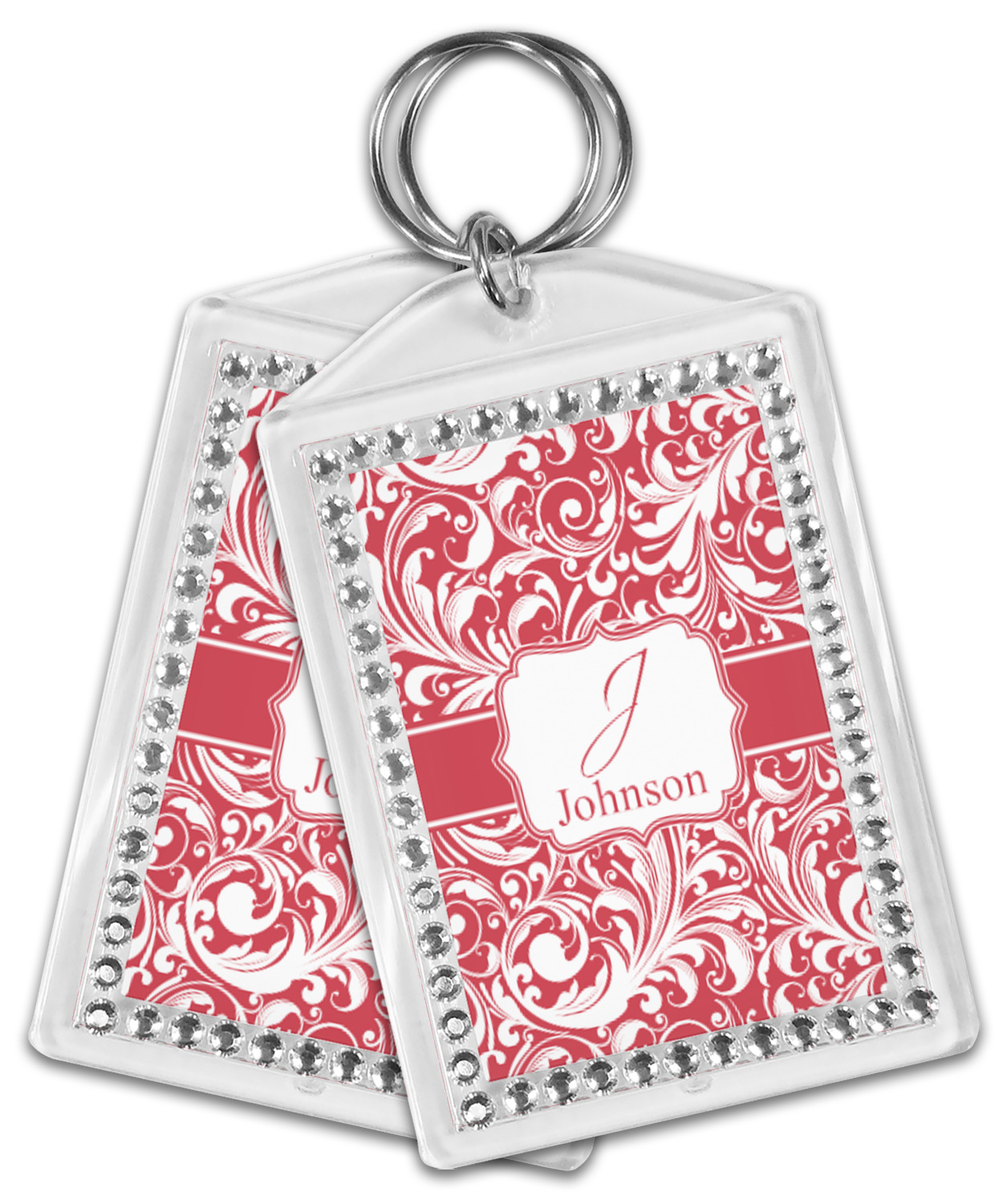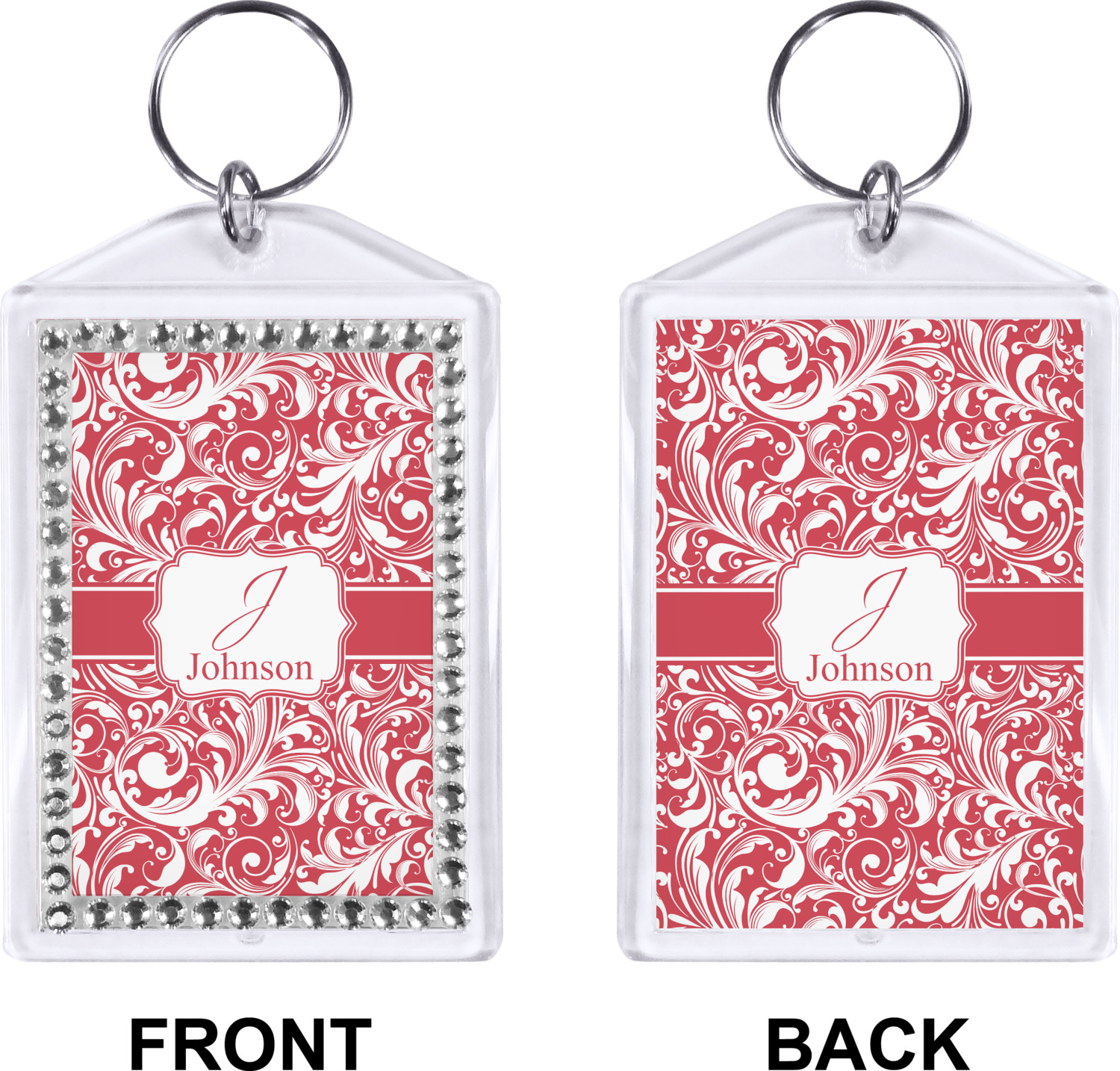 Our personalized keychains have a bold, rectangular shape, outlined by a series of shimmering rhinestones. A metal, split keyring is included with your purchase, and an additional metal hoop allows for attachment of the keychain to the split ring. This unique keychain measures at about 3.75 by 2.5 inches. We print your customized design(s) across both the back and front of this keychain.