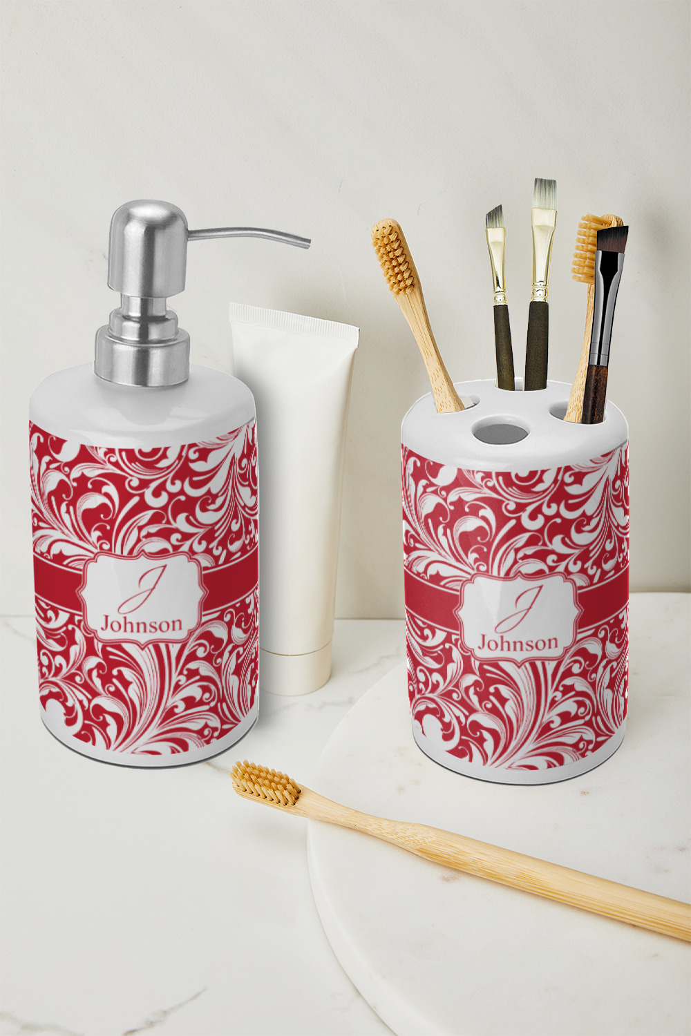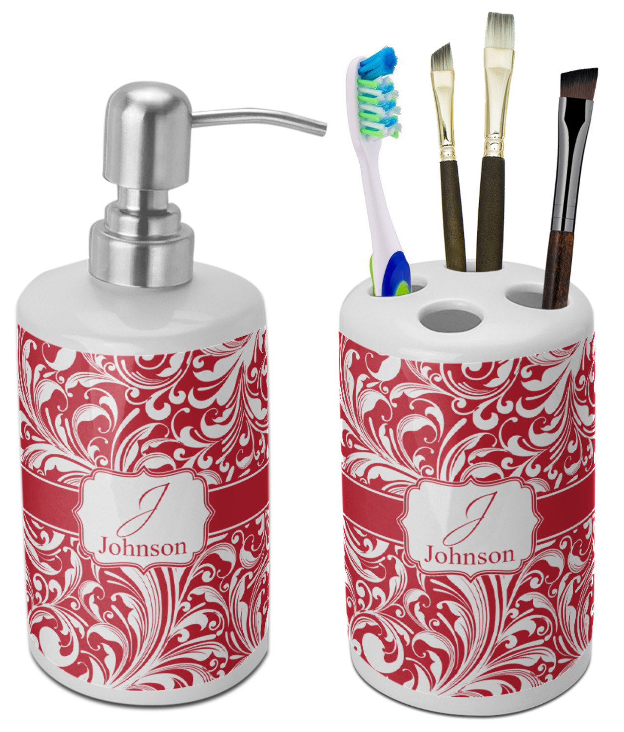 This two piece, ceramic bathroom set will add the perfect splash of color to any bathroom. This set includes one pump dispenser, ideal for soap or lotion, and one toothbrush holder with four holes. Although originally designed for toothbrushes, the holder will also hold make-up brushes, nail files, and other bathroom tools.