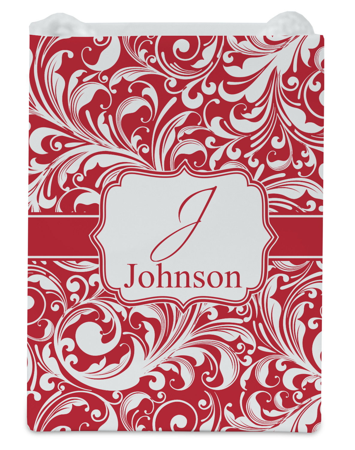 This fun and flirty pattern is available in multiple colors. The design has a classic ribbon in the color of you choice trimmed in white. The decorative white label is trimmed in the color of your choice. Add an initial and a name for that personal touch to pull the entire design together.