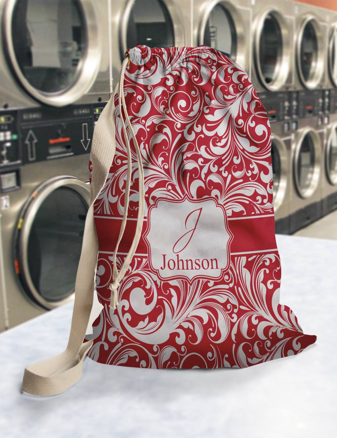 Carry your laundry in style with these customized laundry bags. Available in two sizes, featuring a natural colored woven strap and a cinch cord, these bags hold a lot of clothes or anything else you want to fit in them.
