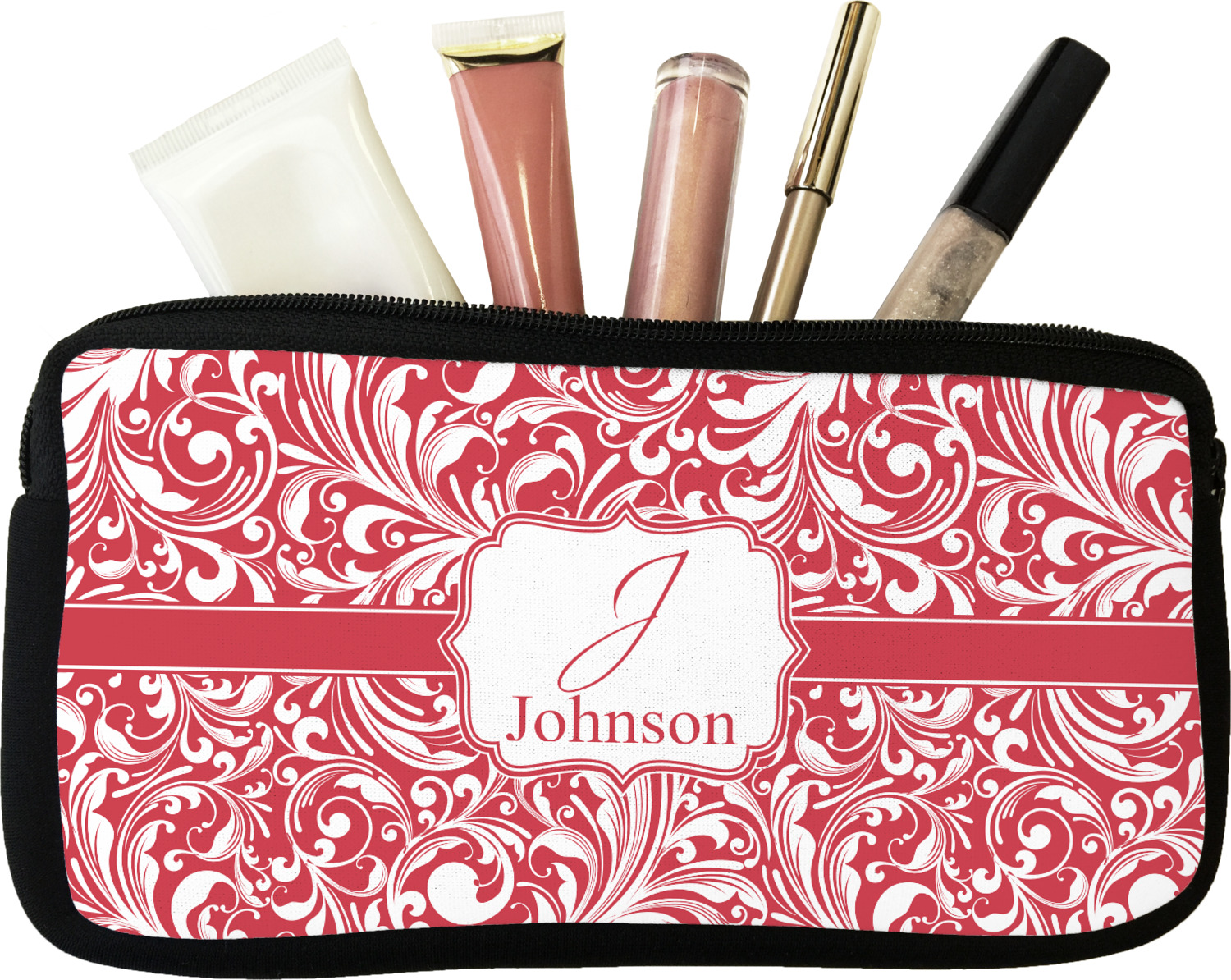 Our personalized makeup bags are available in many different designs, patterns and colors - so you are sure to find one that will love. They are made of neoprene (same material as wet-suits) and thus are water resistant, so spillages in your makeup bag will not end up all over you purse. They are customized on one side and are black on the other side and the zipper is black as well.