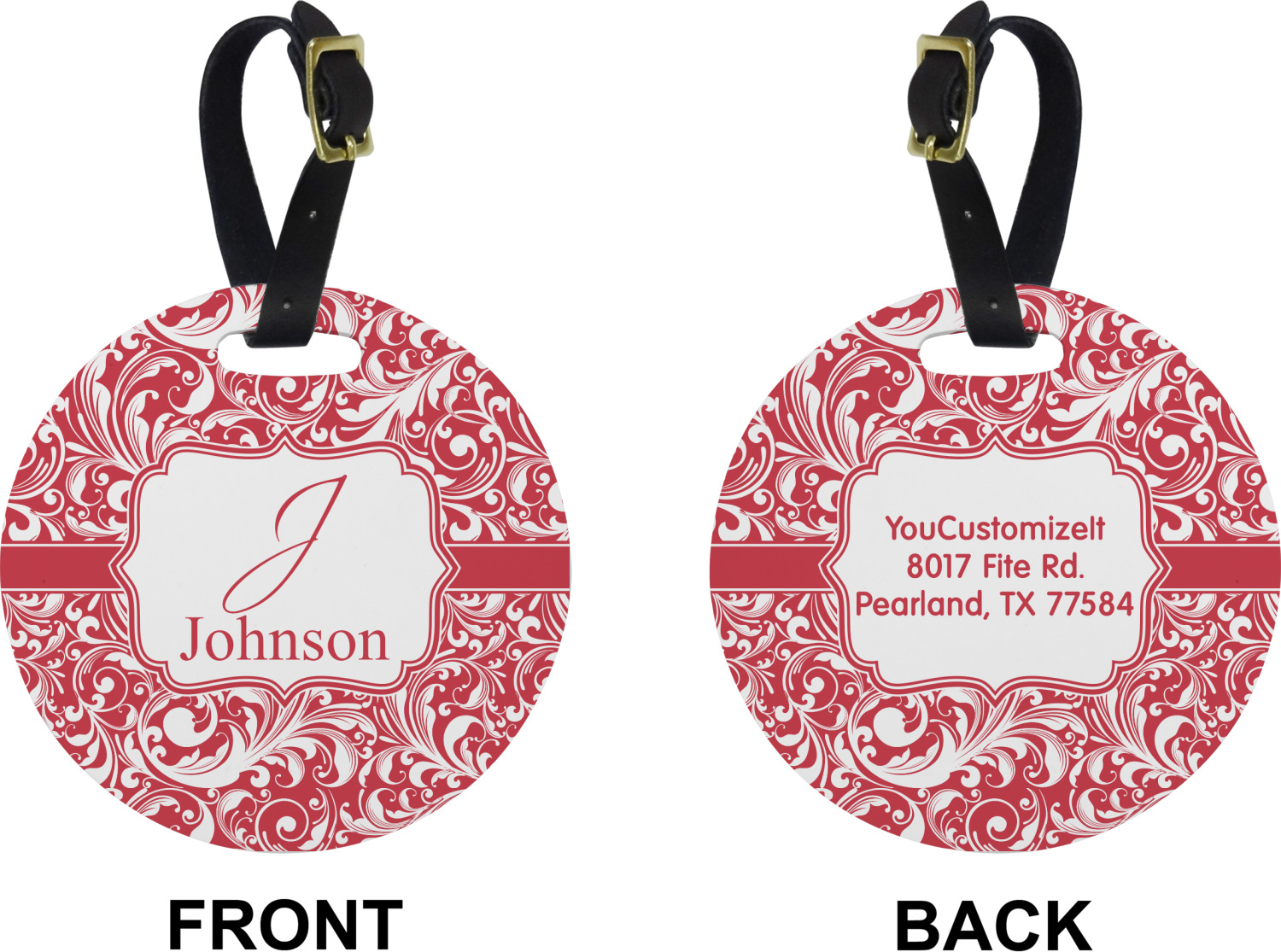 These personalized bag tags are sold in a variety of shapes, so that you may find the product that meets your vision exactly. We sell a round luggage tag, which measures at approximately 4" x 4". Our square luggage tag is about 3.5" x 3.5", while our rectangular version is 2.75" x 4 ".