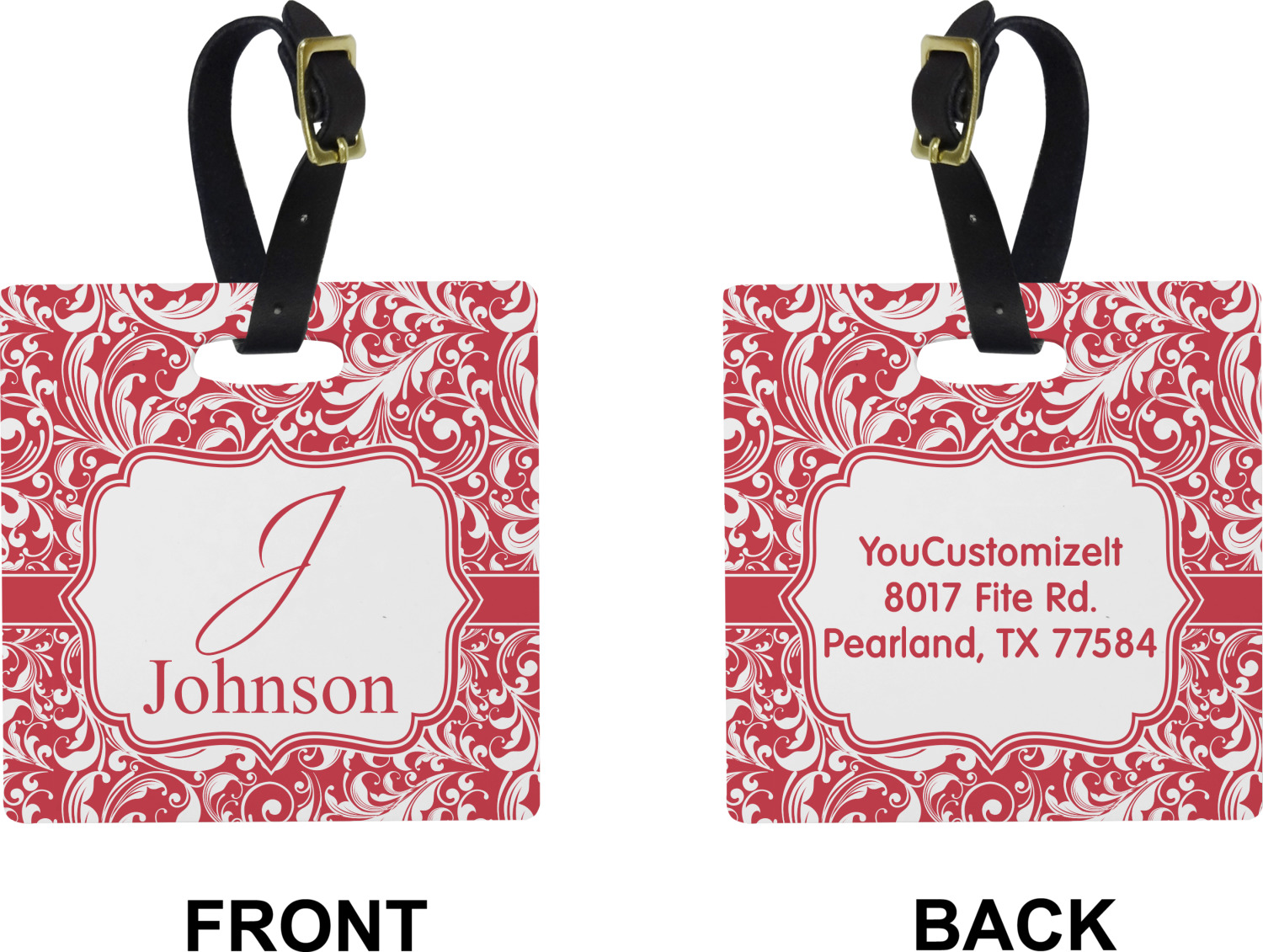 These personalized bag tags are sold in a variety of shapes, so that you may find the product that meets your vision exactly. We sell a round luggage tag, which measures at approximately 4" x 4". Our square luggage tag is about 3.5" x 3.5", while our rectangular version is 2.75" x 4 ".